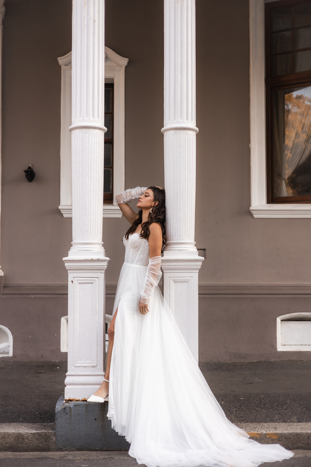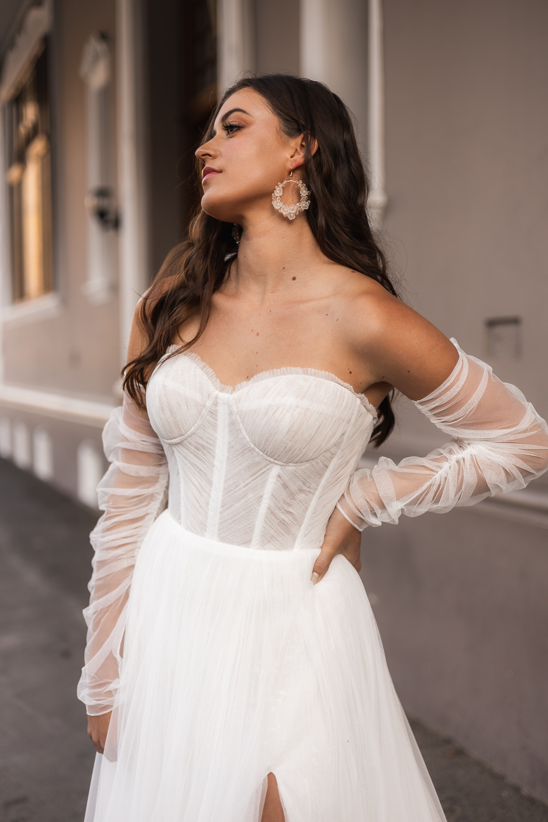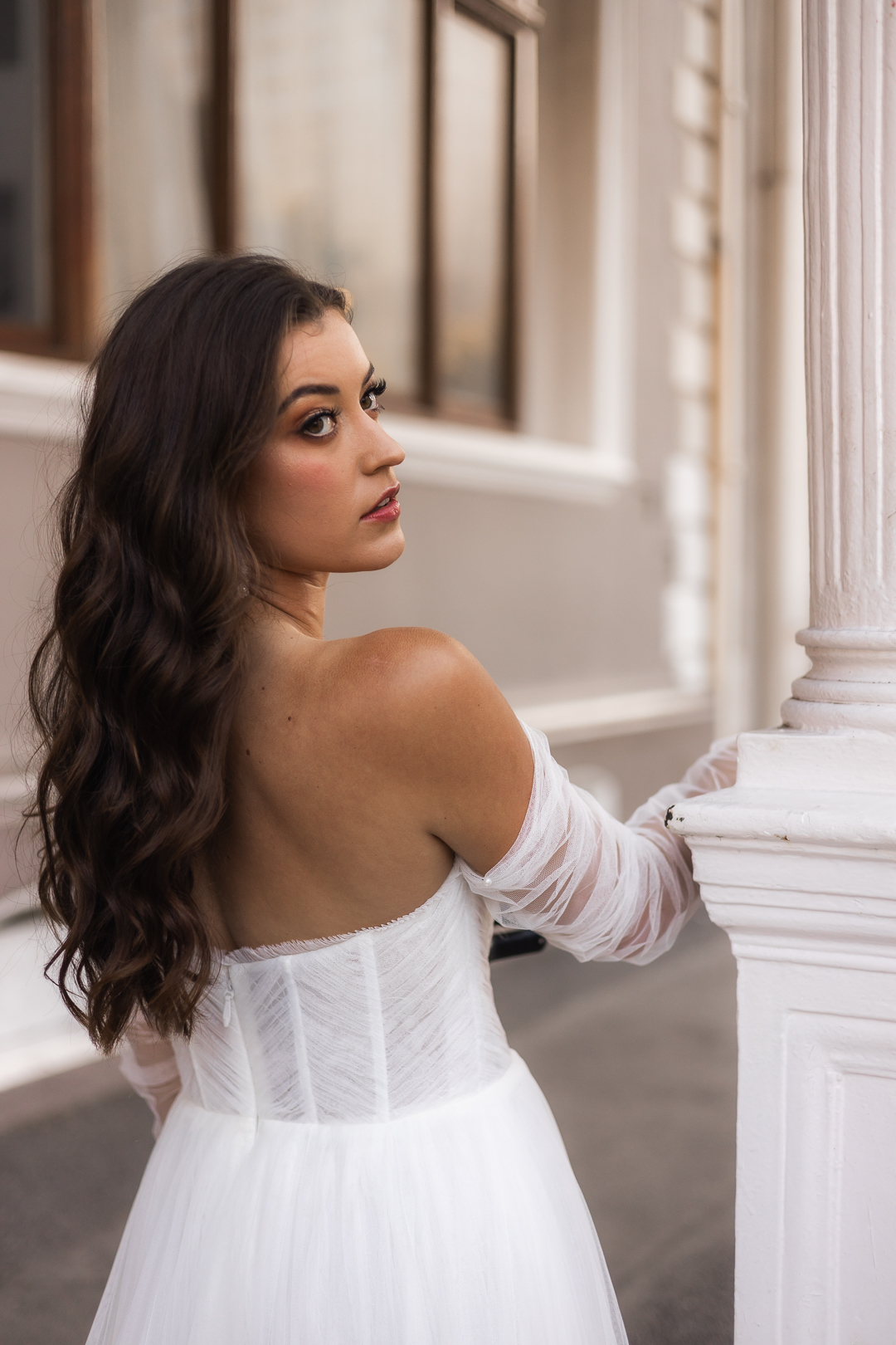 Discover the ethereal beauty of the Ava wedding dress by Blanco Bridal Couture. Crafted from delicate off-white tulle, this gown exudes an air of sophisticated romance. The exposed corset top, adorned with exquisite pleating, adds a touch of modern allure while showcasing impeccable craftsmanship. Beneath the surface, layers of Chantilly lace and pleated tulle create a rich tapestry of textures, enhancing the dress’s luxurious feel. The A-line skirt flows gracefully, providing a timeless silhouette that is both elegant and enchanting. Aria is the perfect choice for the bride who seeks a dress that combines contemporary elegance with classic luxury on her special day.