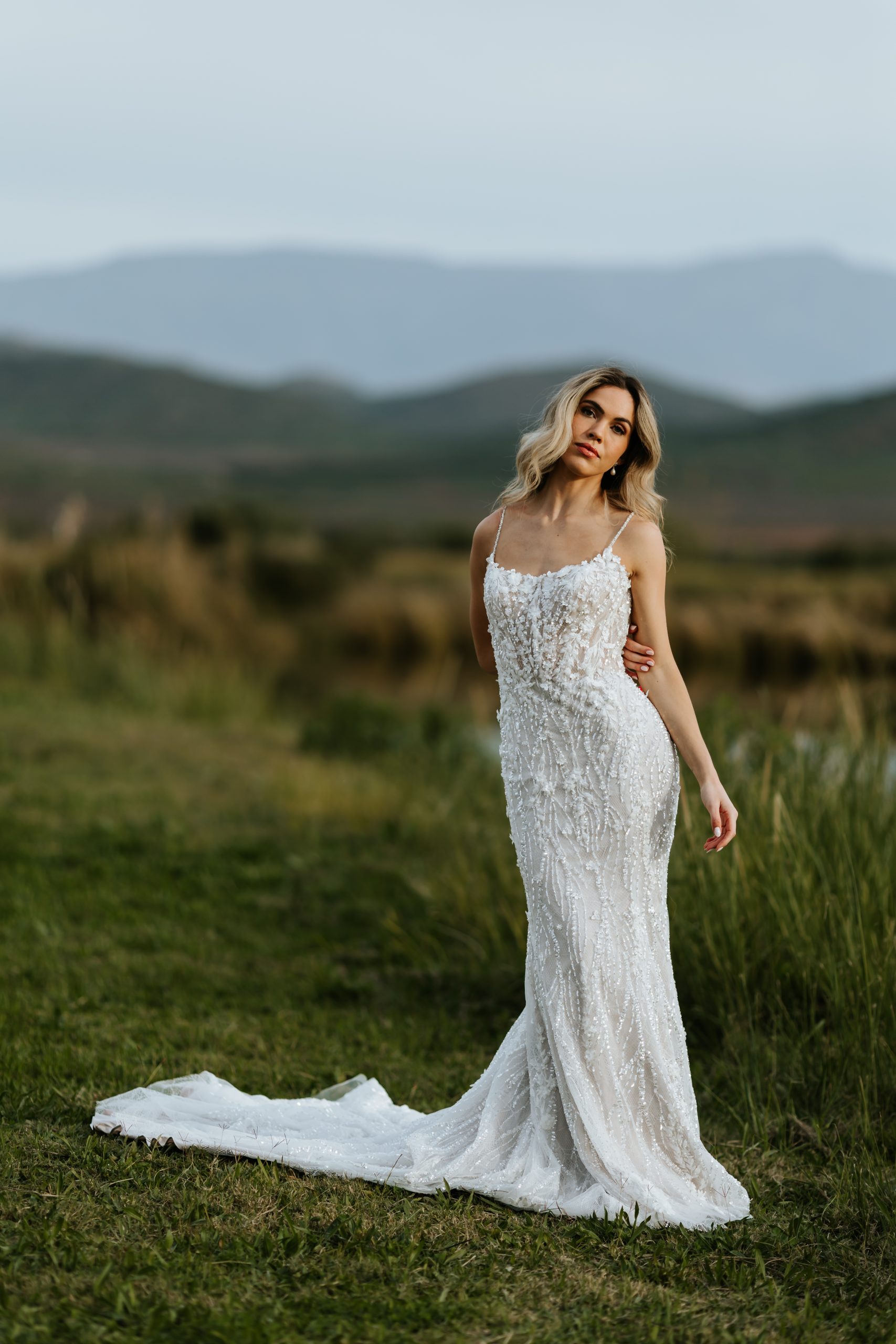Introducing Belini, an enchanting fit and flare wedding dress by Blanco Couture. This captivating gown showcases a scoop neckline and delicate thin straps, creating an elegant and feminine look. The dress features a natural waistline that beautifully defines your figure. Adorned with exquisite beaded lace, it exudes a sense of timeless beauty and intricate craftsmanship. The standout feature of Belini is the stunning 3D flowers embellishing the lace, adding texture and depth to the design. Complete with a graceful chapel train, this Blanco Couture creation promises to make you feel like a true bride, radiating grace and sophistication on your special day.