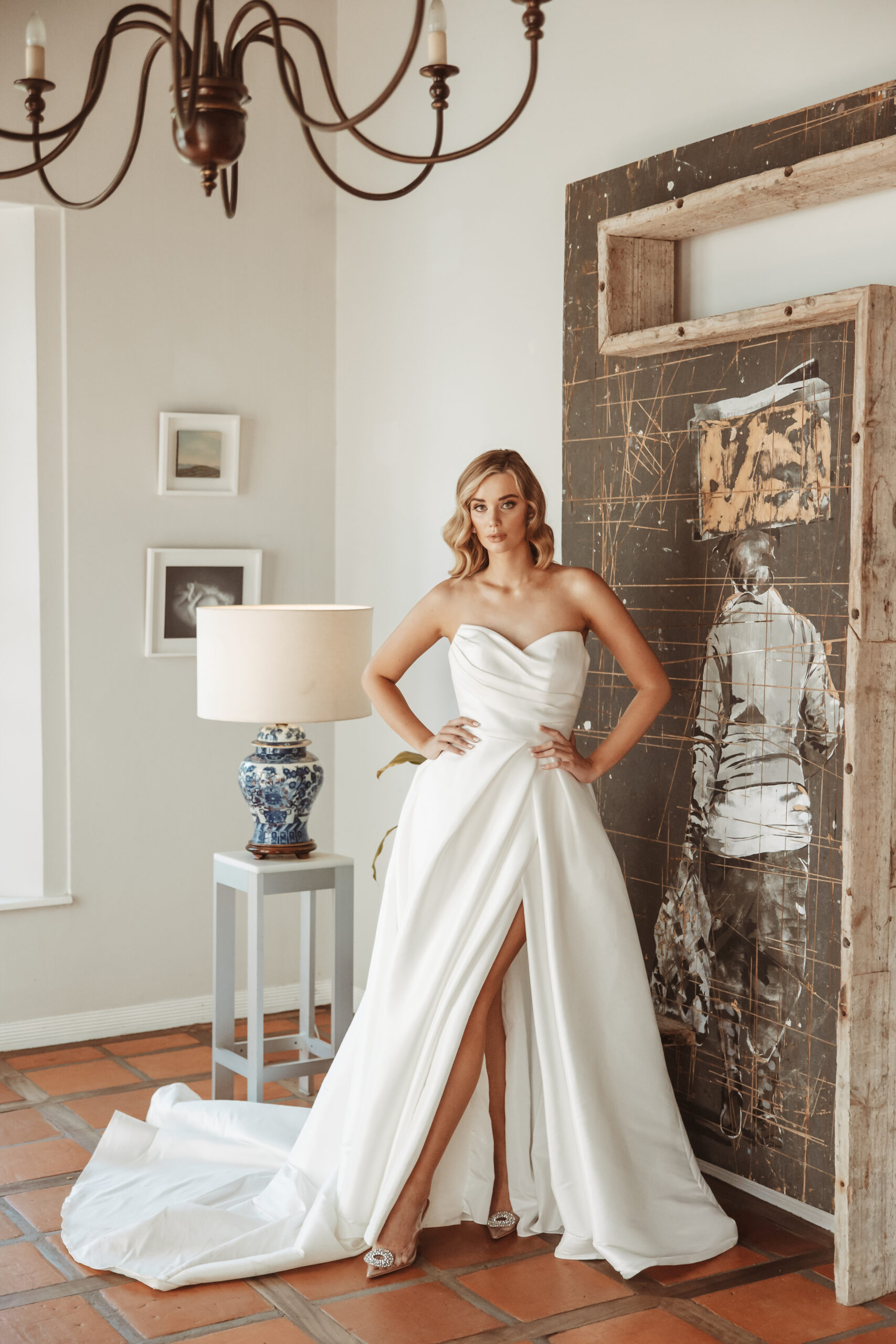 The Brianna gown features a captivating cat eye neckline that exudes modern glamour and allure, framing the bride’s décolletage with understated sophistication. Draping across the bodice adds depth and dimension to the ensemble, enhancing the gown’s flattering silhouette and sculpting a figure that is both statuesque and alluring.