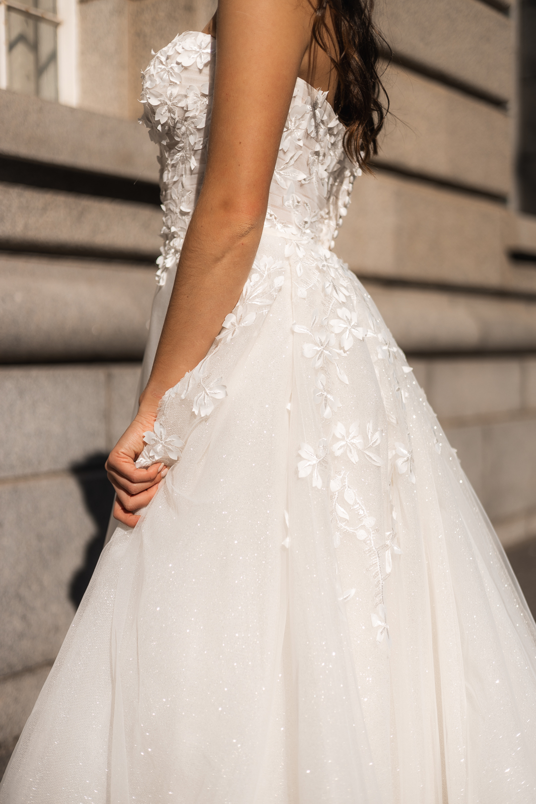 Indulge in the ethereal beauty of the Camilla wedding dress from Blanco Bridal Couture. The enchanting sweetheart bodice, adorned with intricate 3D flower lace and delicate hand-beading, evokes a sense of timeless romance. Thin, detachable straps offer versatility and grace, ensuring a perfect fit for every moment of your special day. Below, a satin sheath skirt cascades with effortless elegance, while a detachable glitter overskirt adds a touch of celestial sparkle, allowing you to transform your look from ceremony to celebration with seamless sophistication. Camilla embodies luxury and refinement, designed for the bride who desires nothing less than extraordinary on her wedding day.