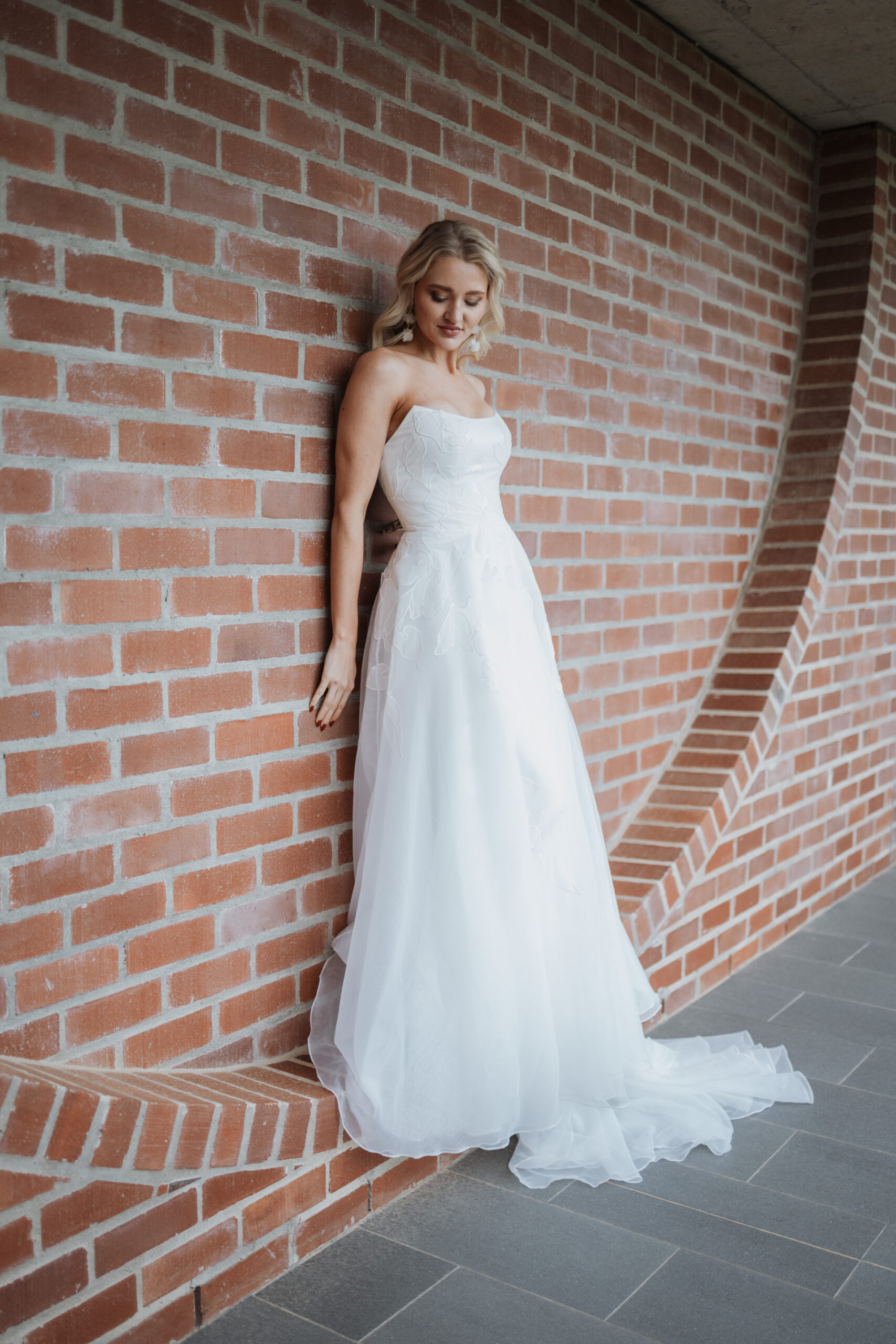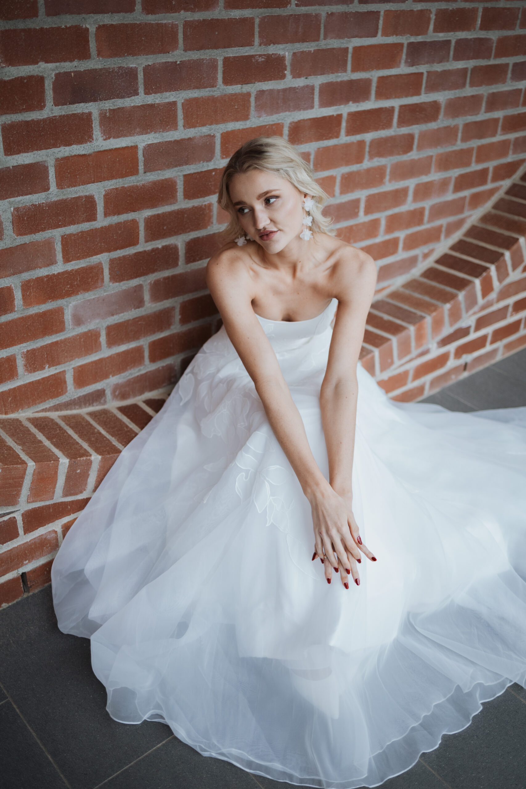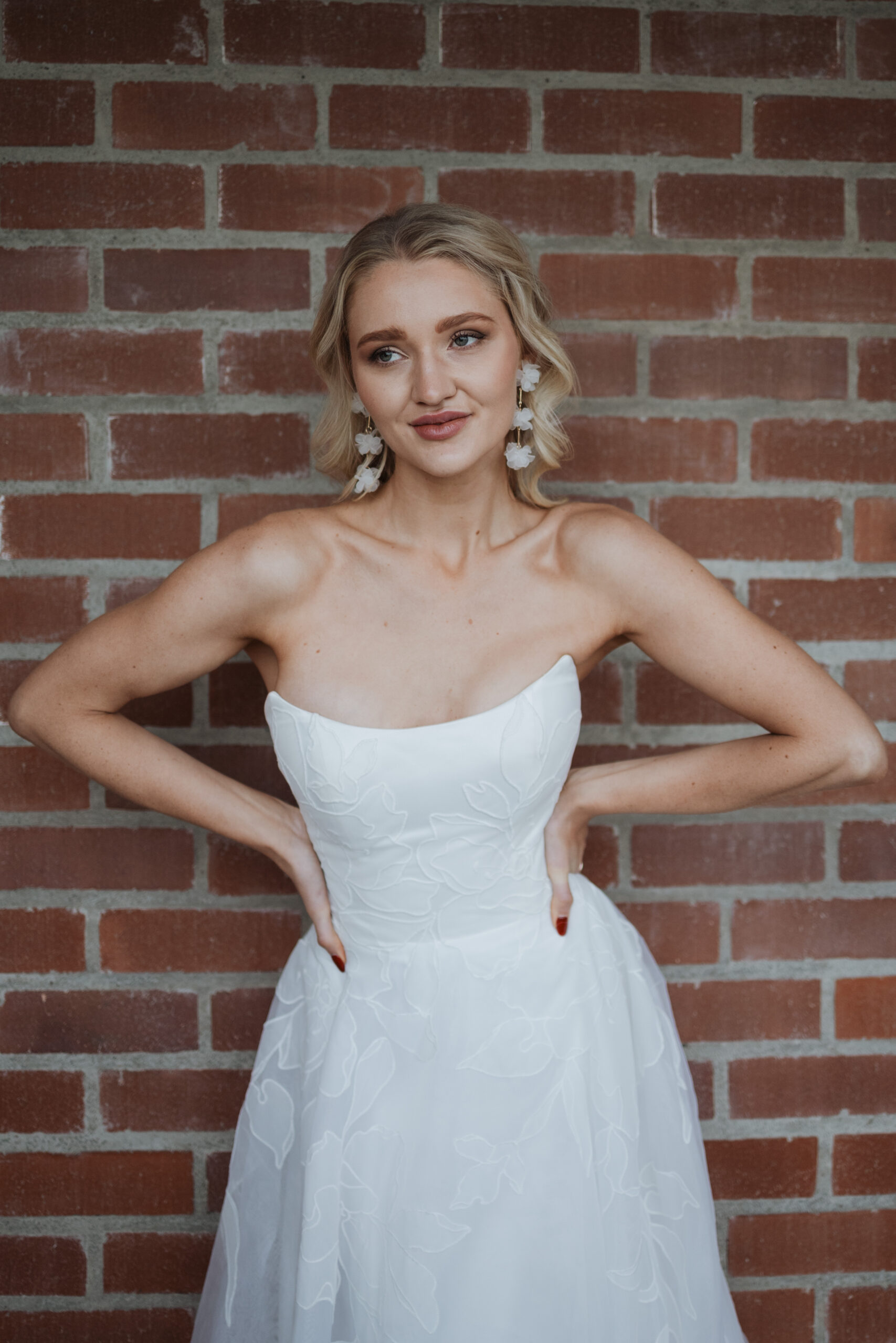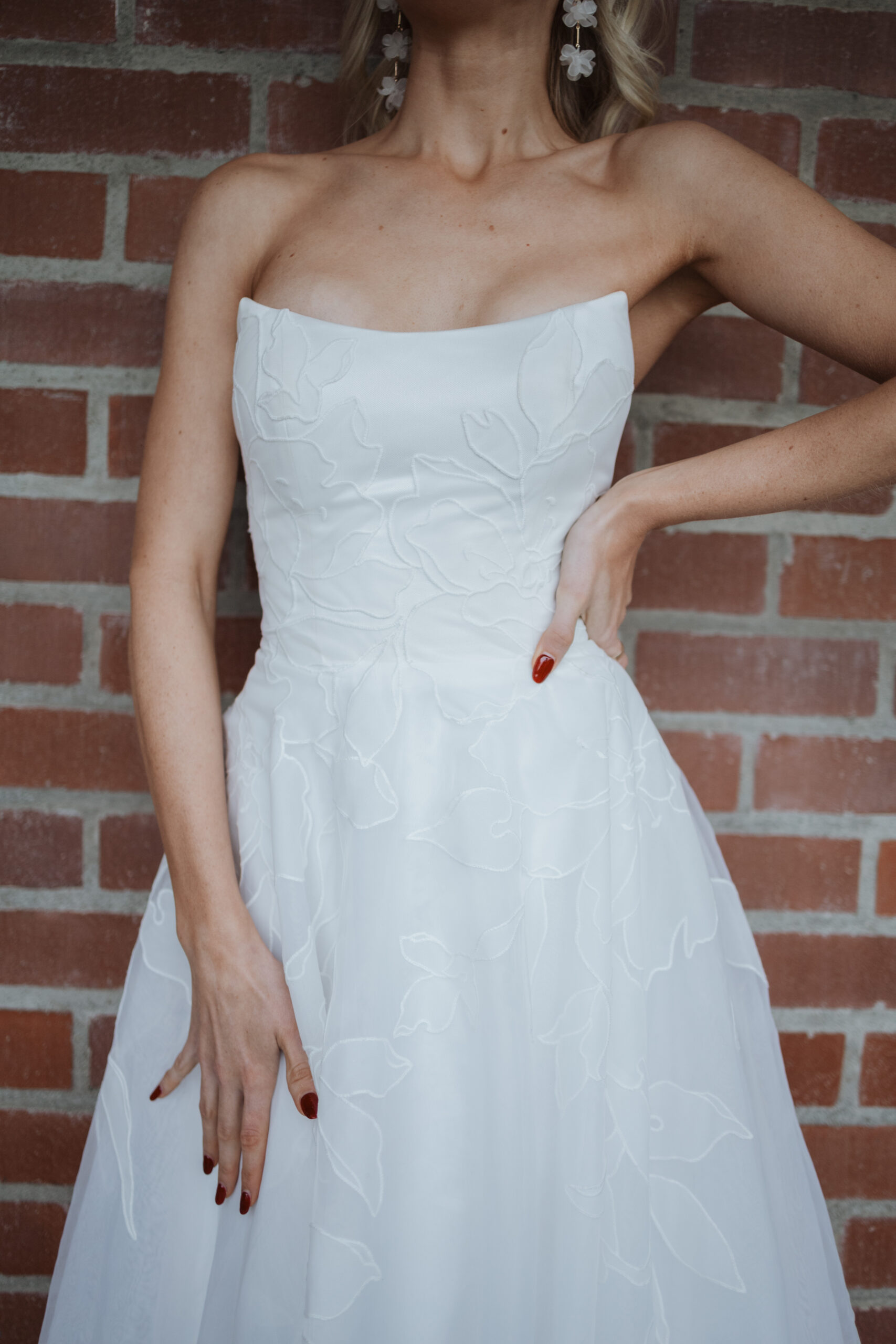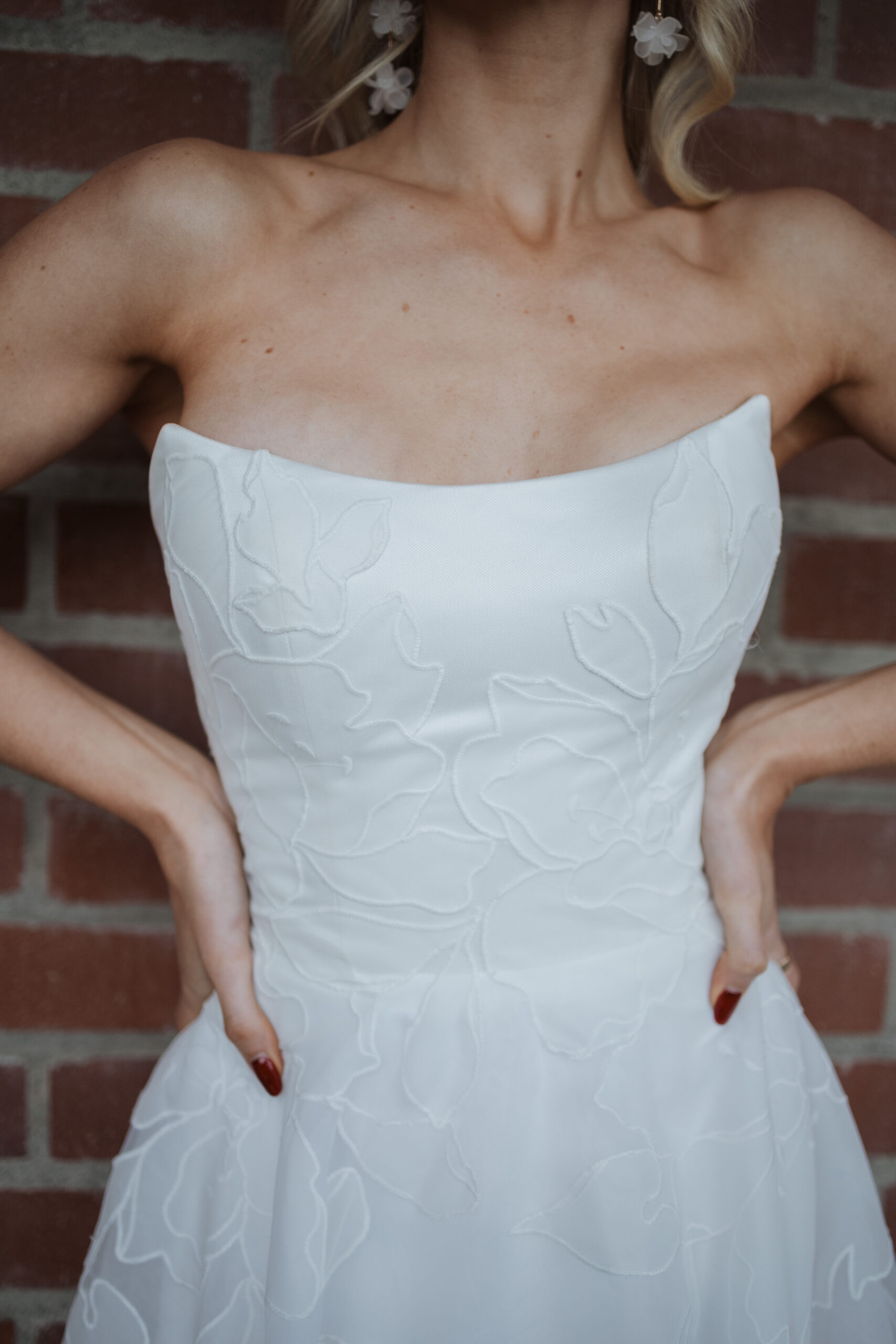 A vision of modern elegance, the Cole gown is crafted in ethereal organza and designed to enchant from every angle. This A-line silhouette features a structured, fully lined bodice with internal corsetry, offering both support and shape beneath its delicate scoop neckline and strapless design.