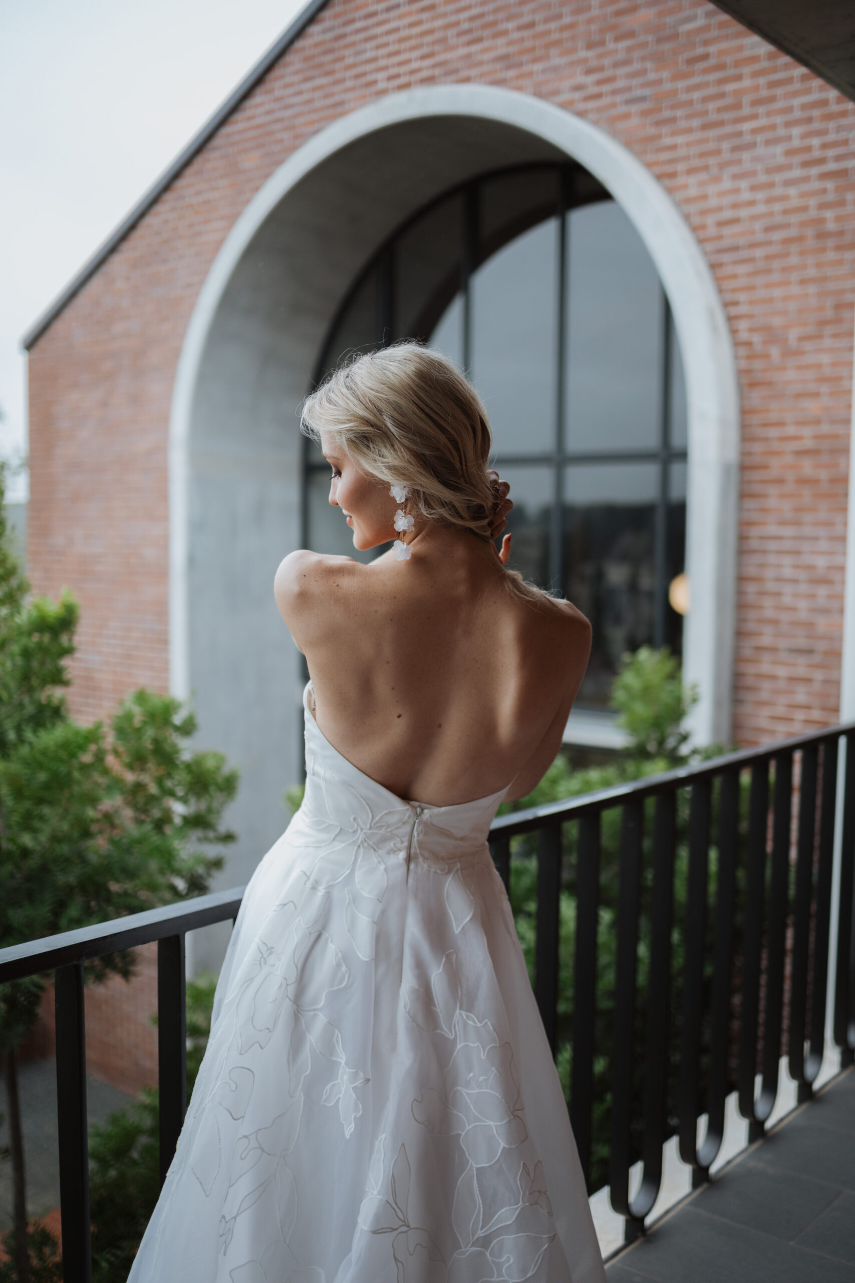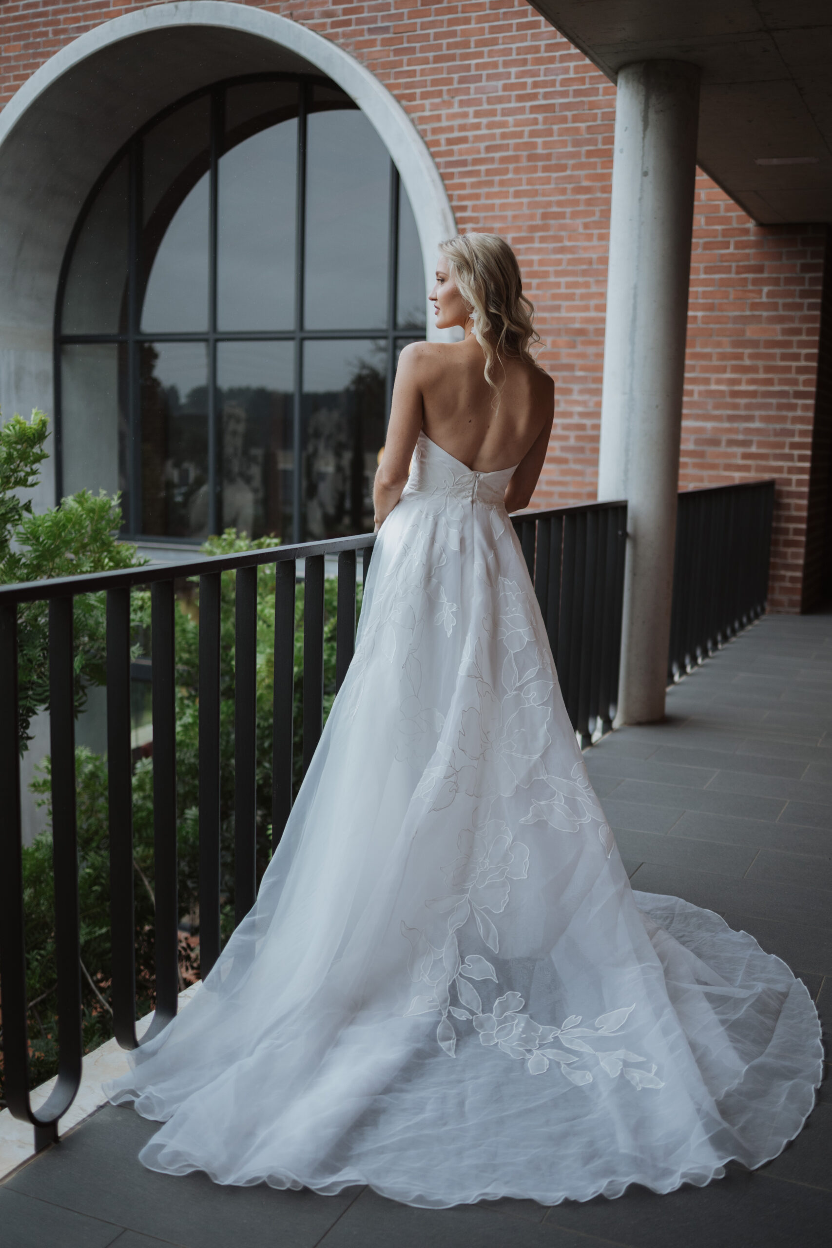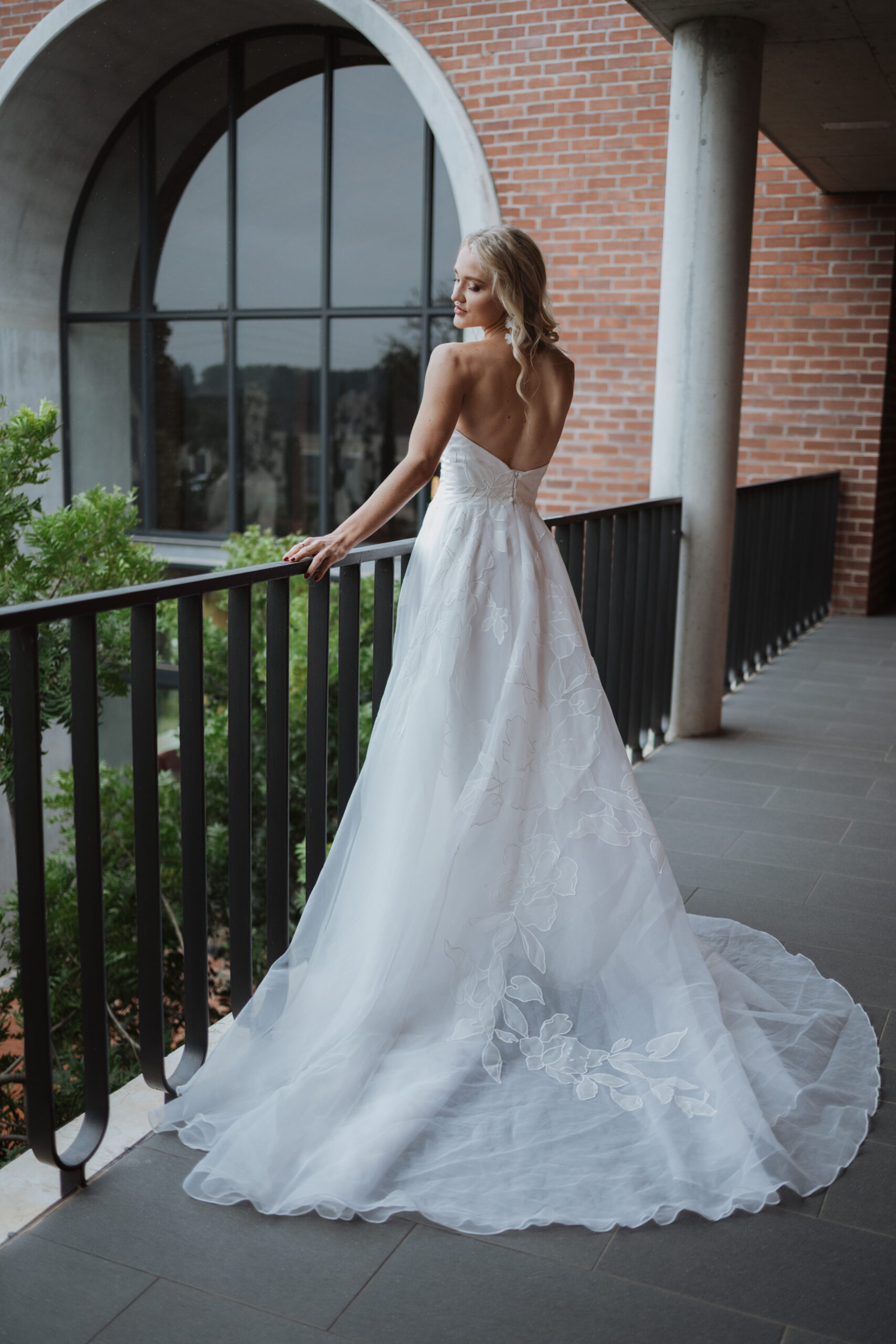 Exquisite laser-cut floral embroidery is artfully scattered across the gown, adding texture and romantic detail to every step. Light, refined, and effortlessly graceful, Cole is the perfect choice for the bride seeking timeless sophistication with a touch of whimsy.