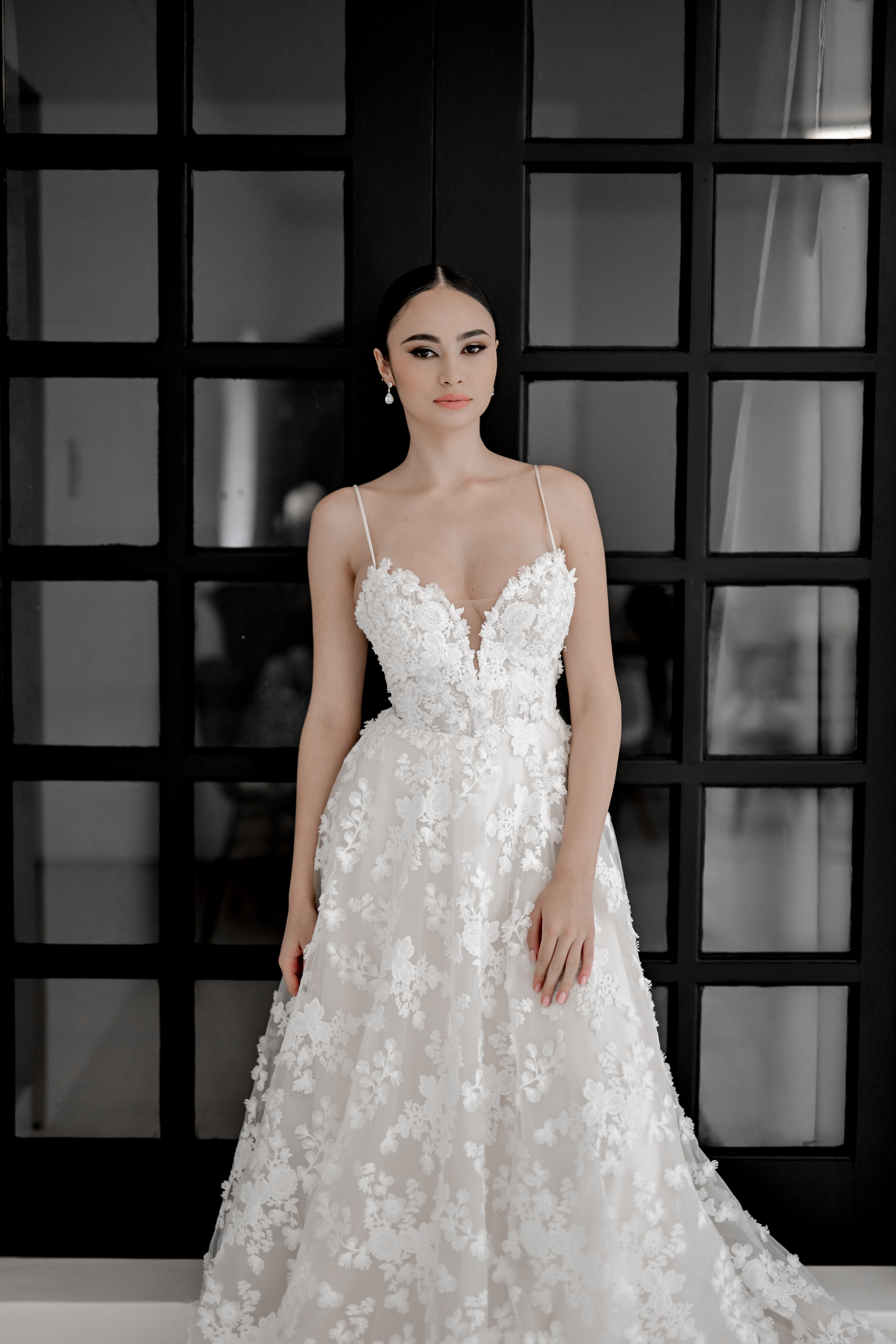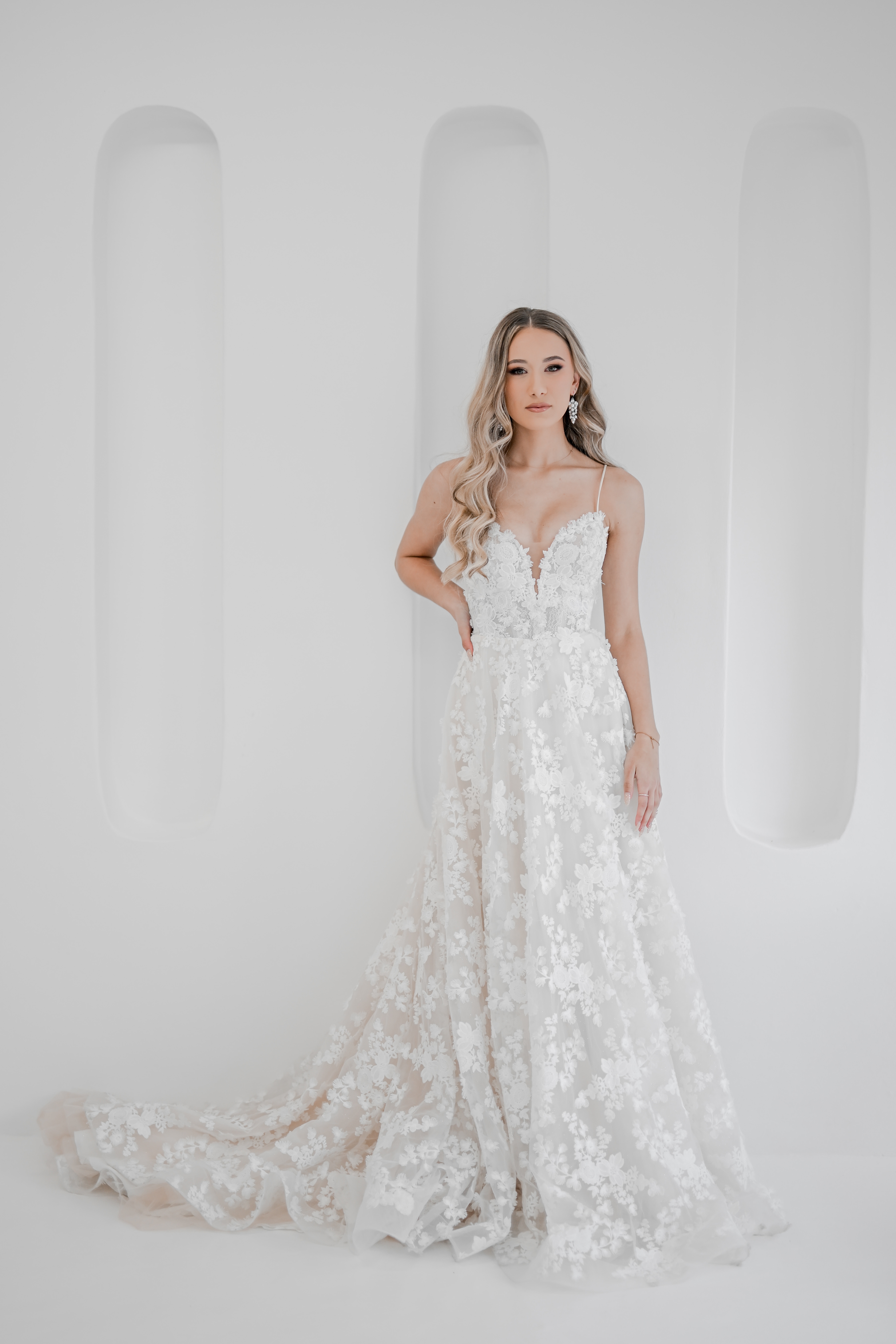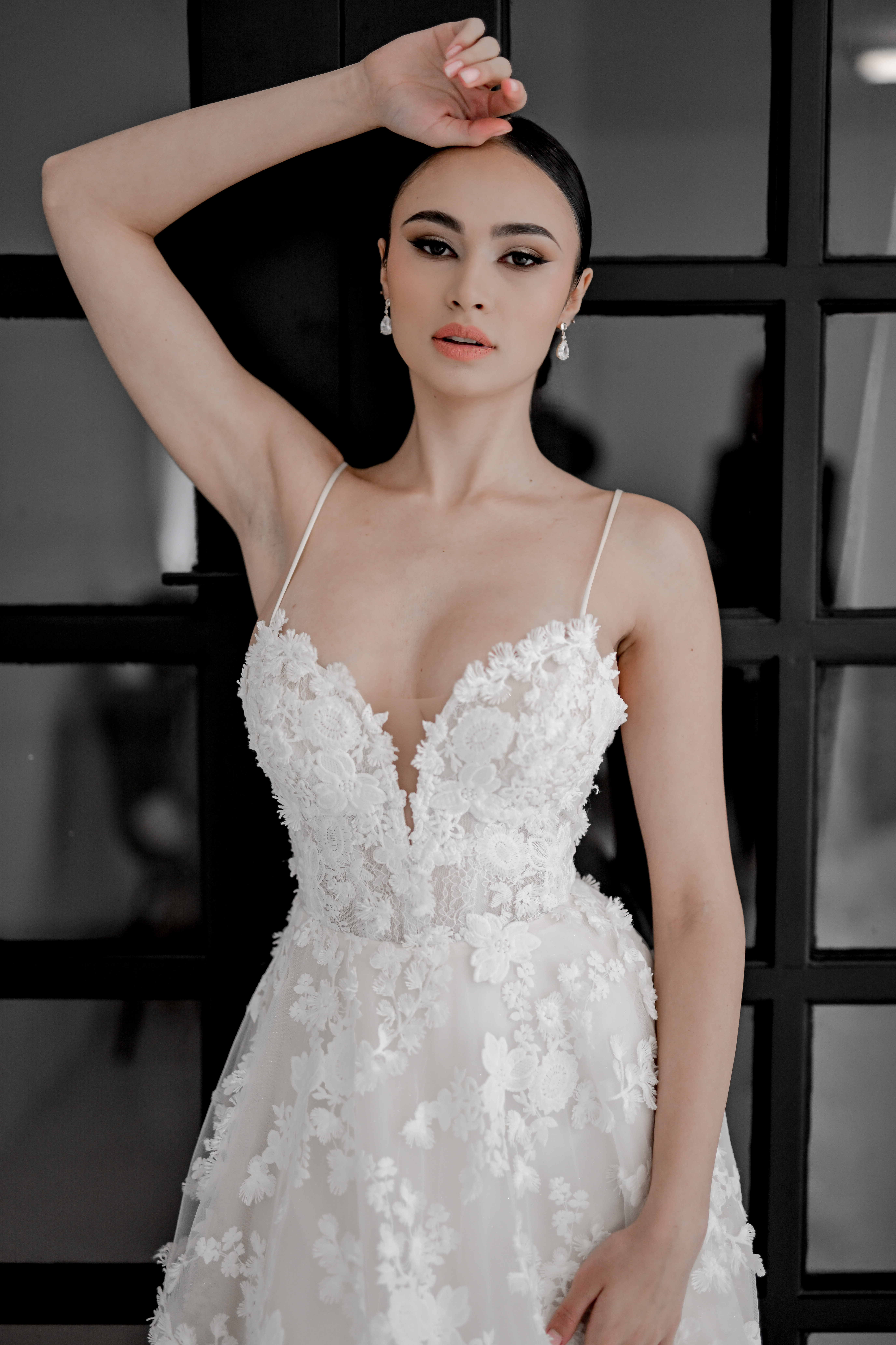 Immerse yourself in the romantic elegance of the Ginewra wedding dress. This full lace A-line gown is a masterpiece of delicate craftsmanship, featuring thin straps that delicately frame the shoulders and a deep V neckline that exudes sophisticated allure. The intricate lace pattern adds an element of timeless beauty, while the row of pearl buttons down the back offers a touch of opulent refinement. Ginewra is the epitome of luxury, designed for the bride who desires a blend of classic charm and modern grace on her unforgettable day.