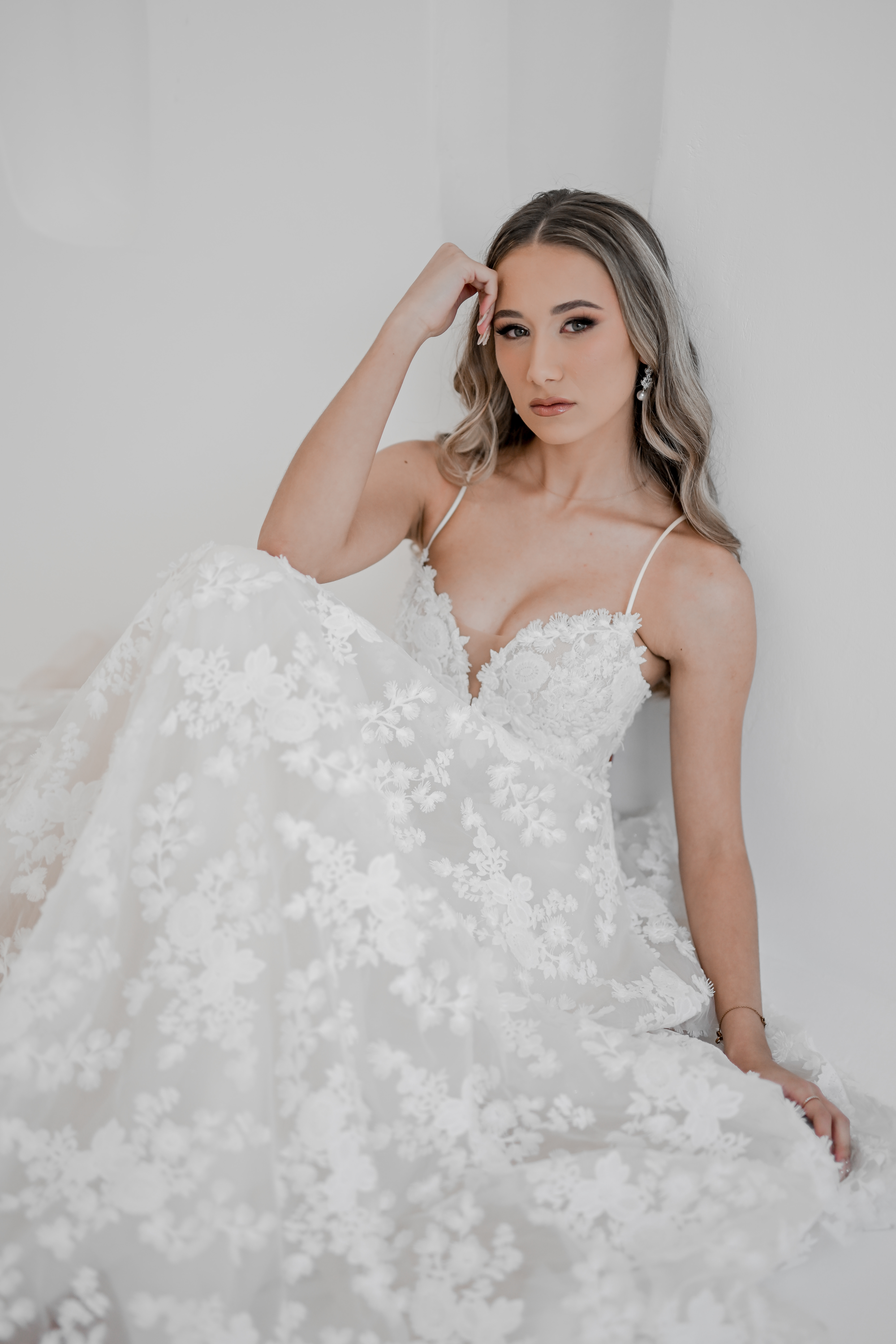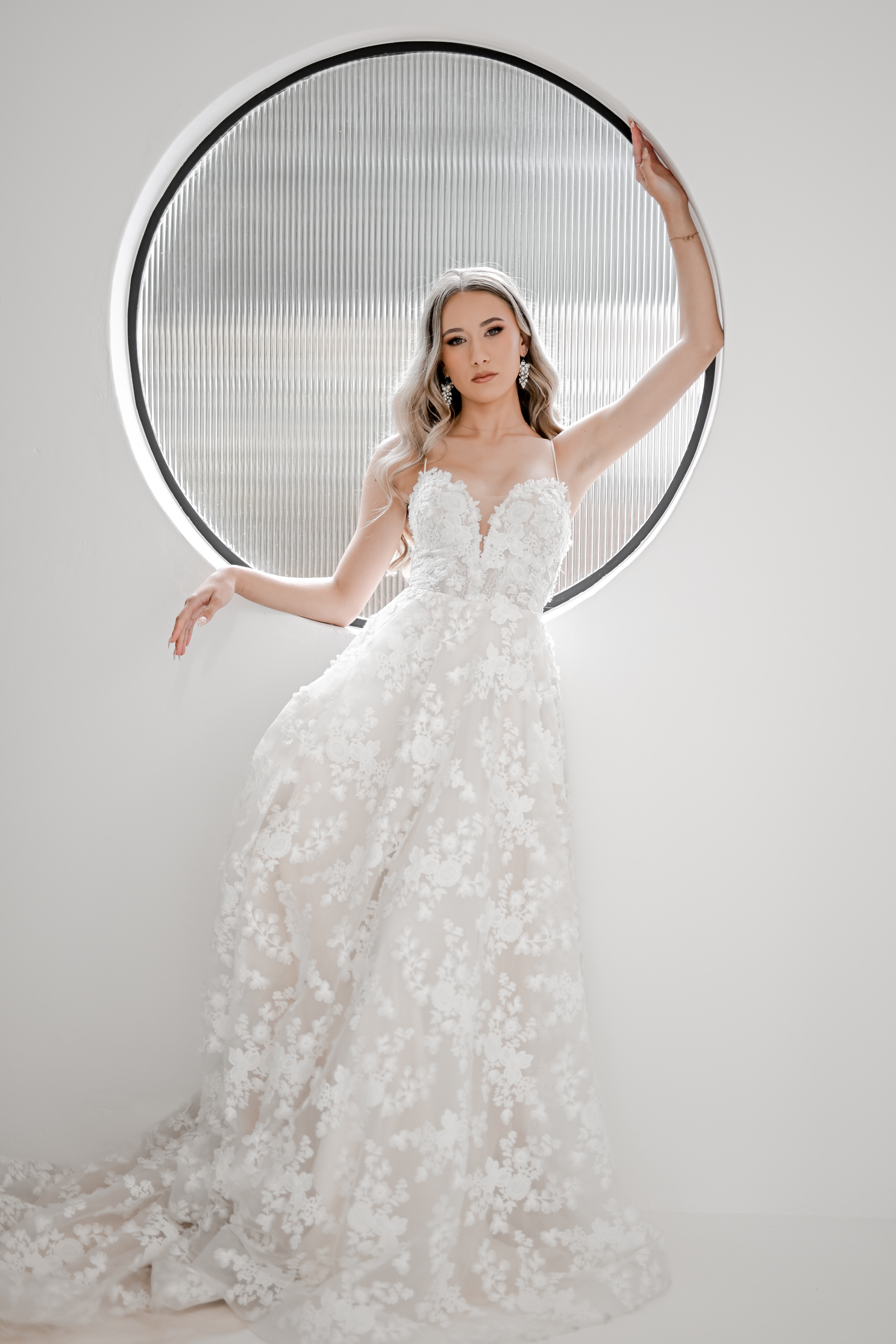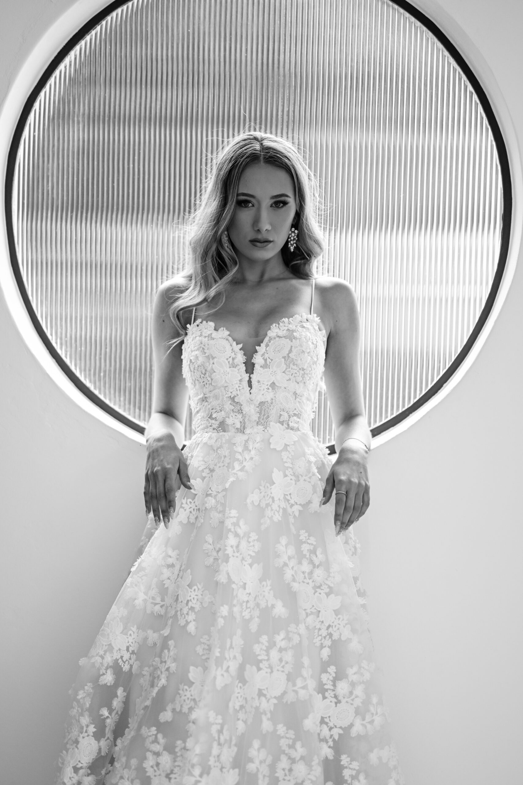 Immerse yourself in the romantic elegance of the Ginewra wedding dress. This full lace A-line gown is a masterpiece of delicate craftsmanship, featuring thin straps that delicately frame the shoulders and a deep V neckline that exudes sophisticated allure. The intricate lace pattern adds an element of timeless beauty, while the row of pearl buttons down the back offers a touch of opulent refinement. Ginewra is the epitome of luxury, designed for the bride who desires a blend of classic charm and modern grace on her unforgettable day.