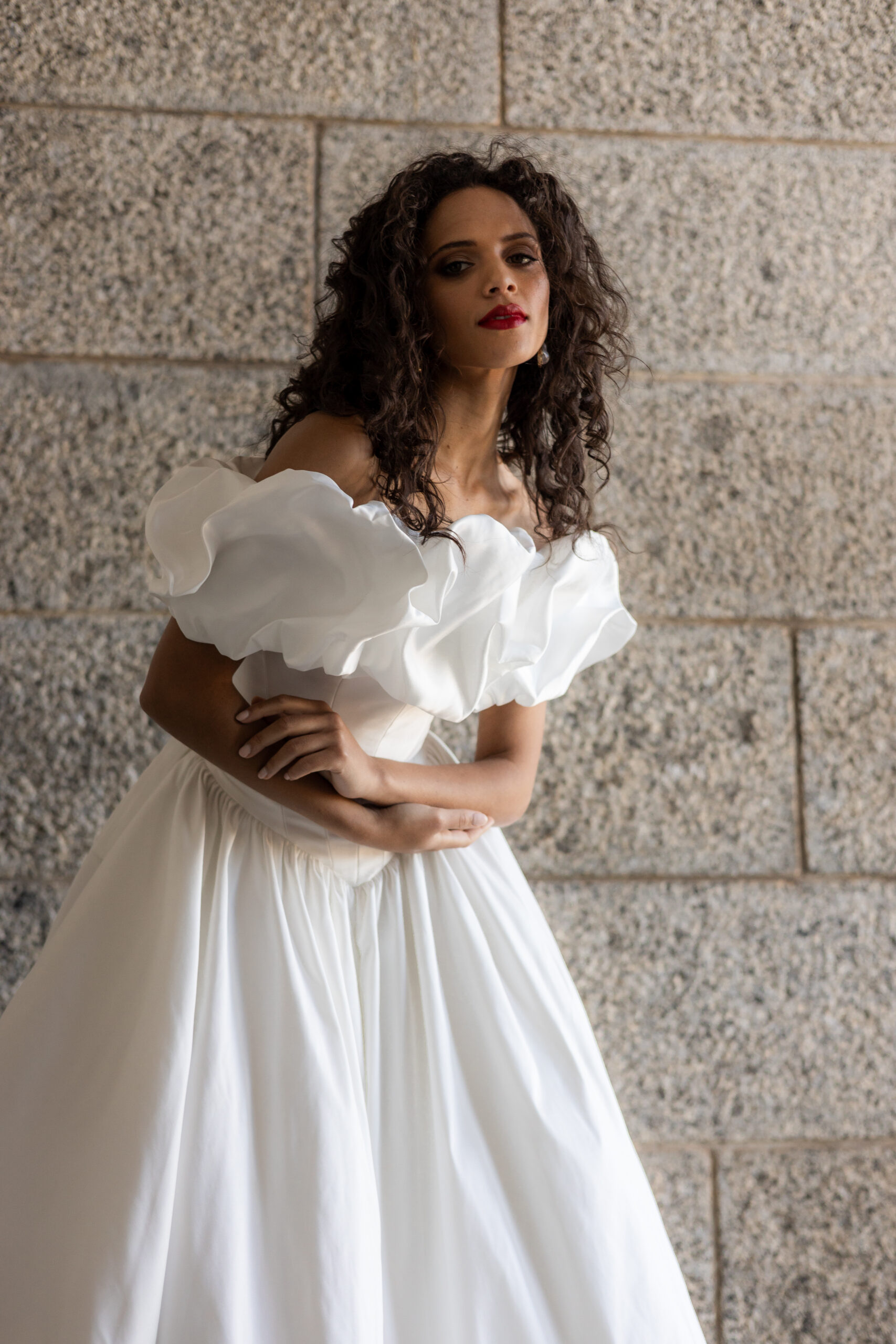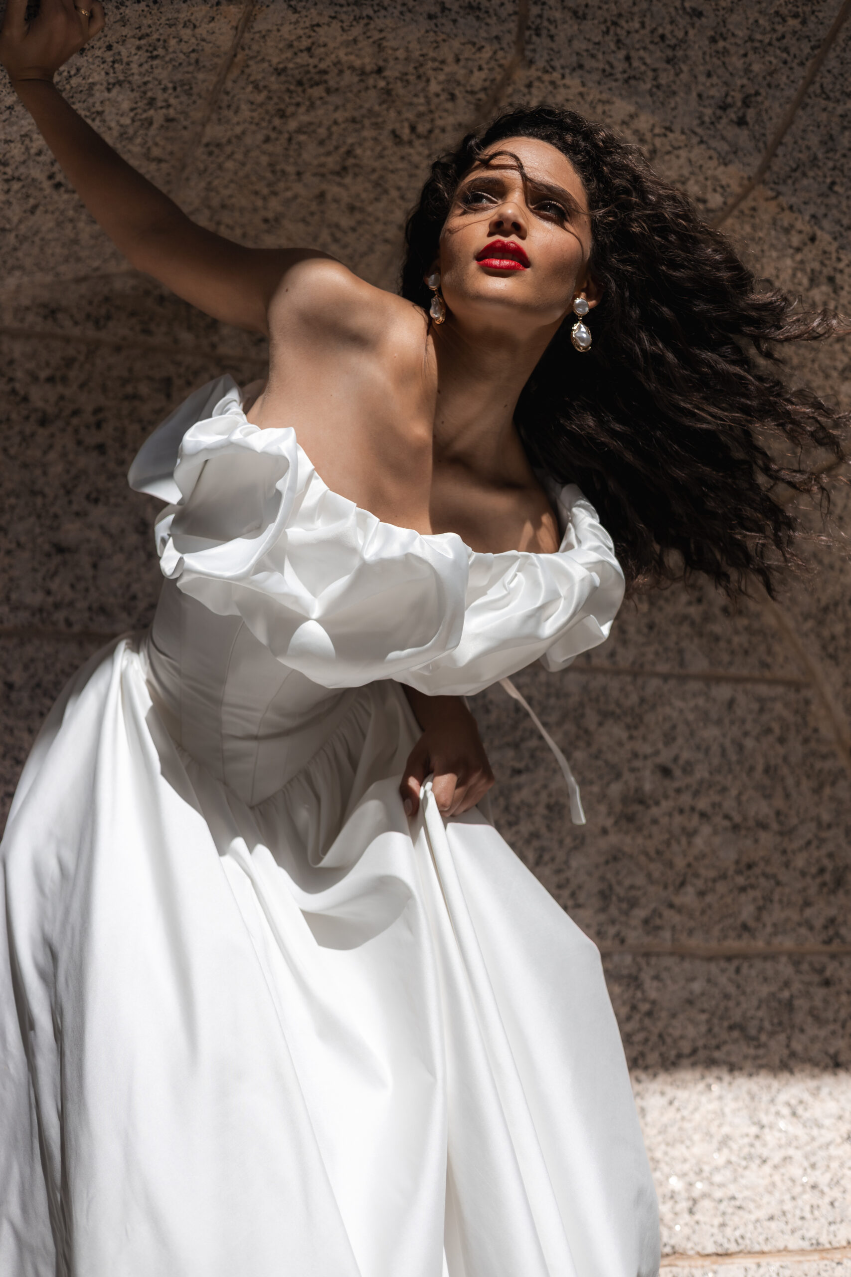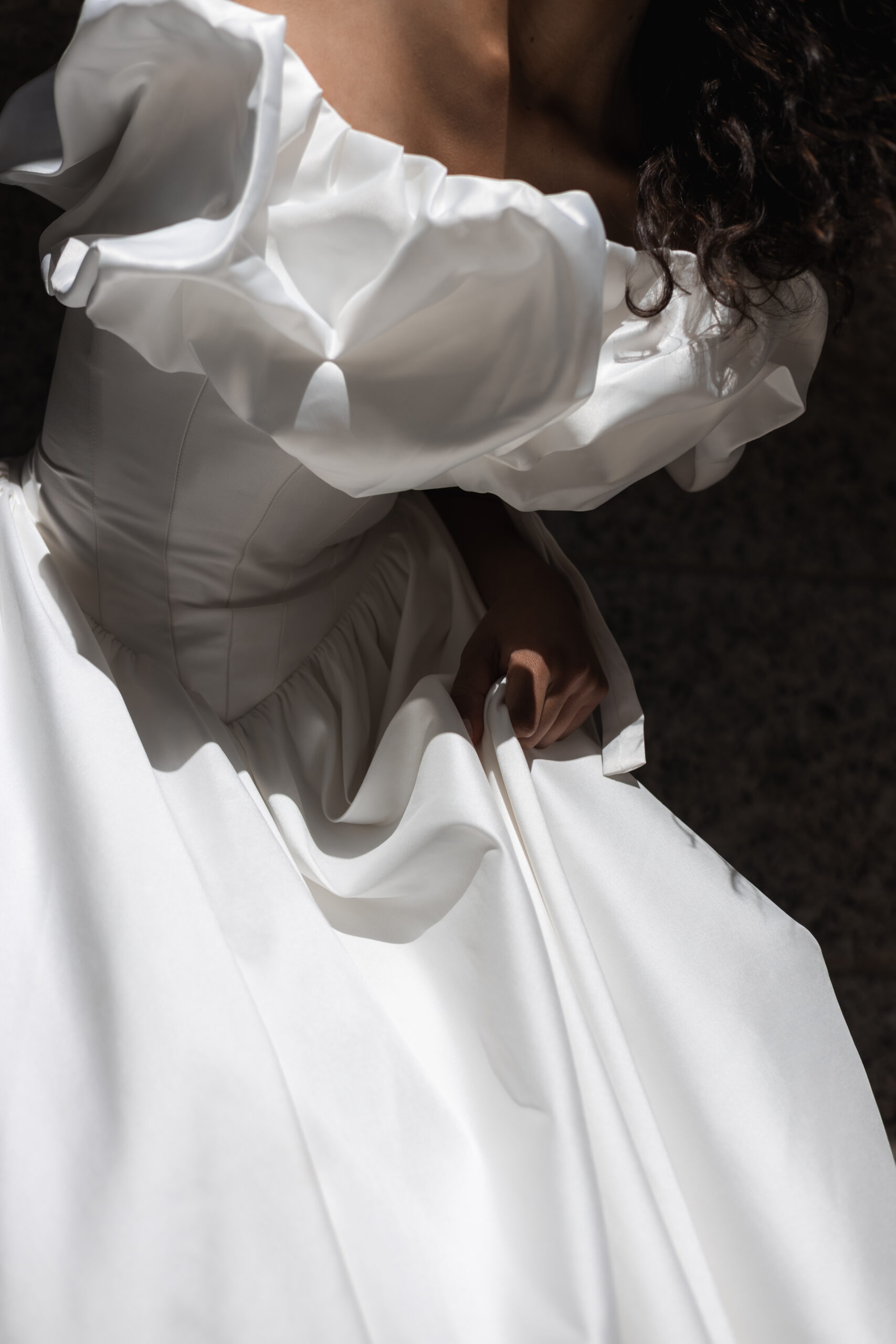 A timeless satin ballgown defined by its gathered skirt and sculpted Basque waistline. The scoop neckline offers a soft, modern elegance, while a row of buttons trailing down the train adds a touch of classic refinement. A gown designed for the bride who loves understated grandeur and flawless simplicity.
