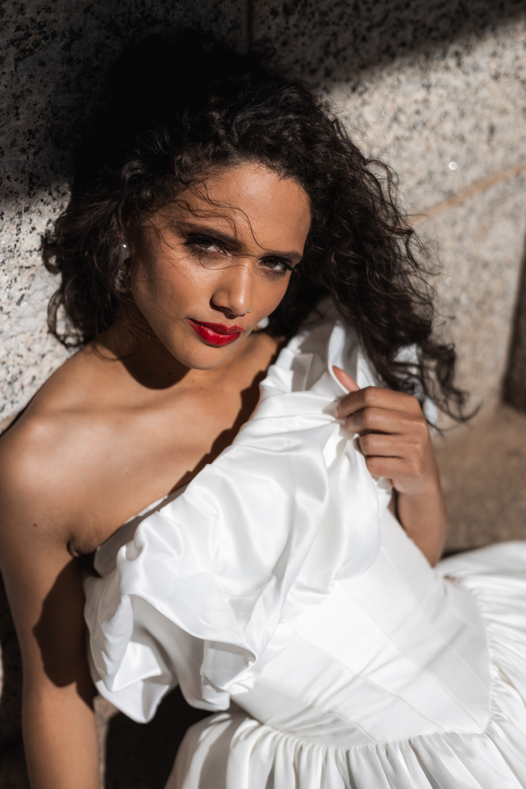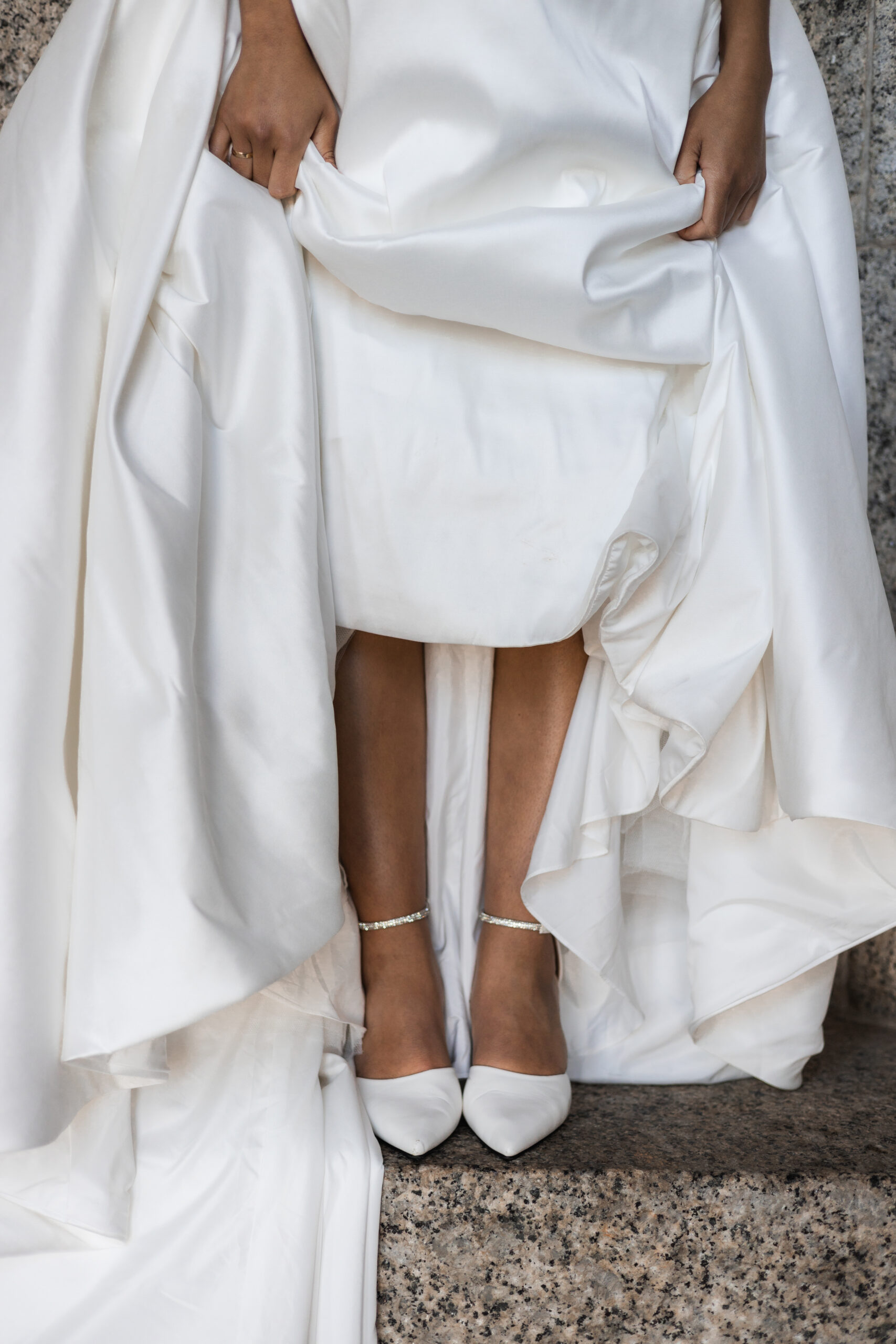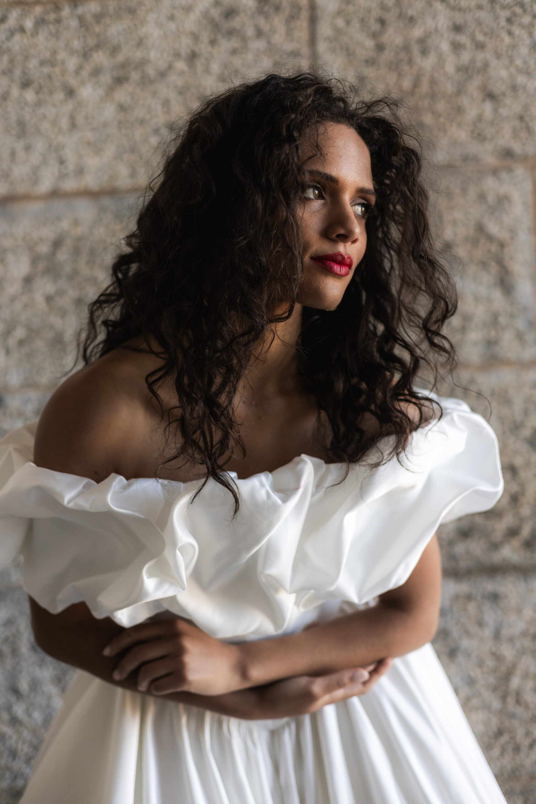 A timeless satin ballgown defined by its gathered skirt and sculpted Basque waistline. The scoop neckline offers a soft, modern elegance, while a row of buttons trailing down the train adds a touch of classic refinement. A gown designed for the bride who loves understated grandeur and flawless simplicity.