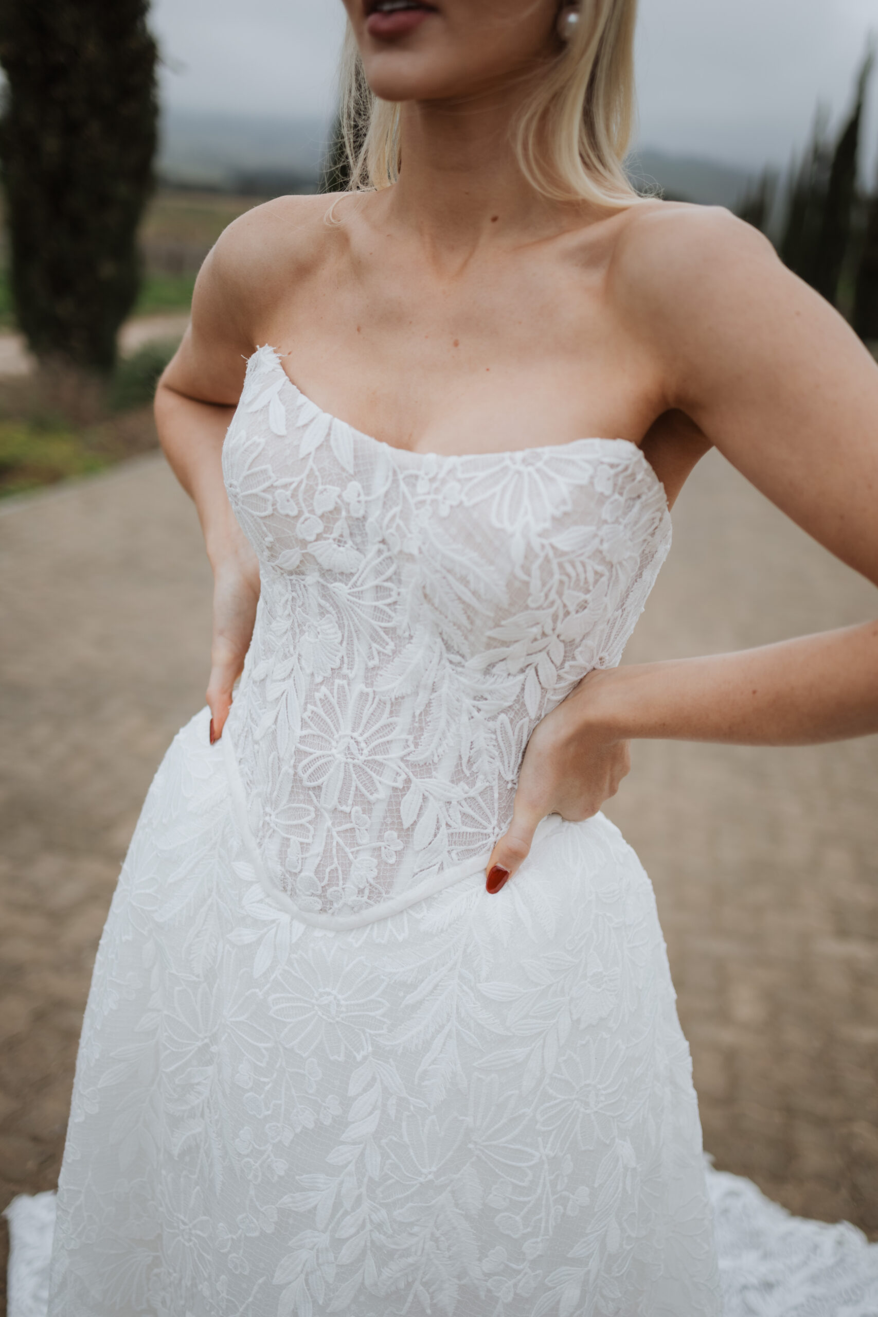 The fully embroidered lace overlays a subtle layer of glitter tulle, adding a soft shimmer that catches the light with every step. A defined basque waistline with elegant piping offers structure and shape, while a scalloped hem adds a graceful, vintage-inspired finish. Marilyn is perfect for the bride who adores timeless beauty with a touch of sparkle.