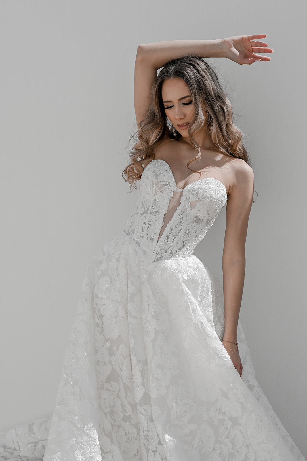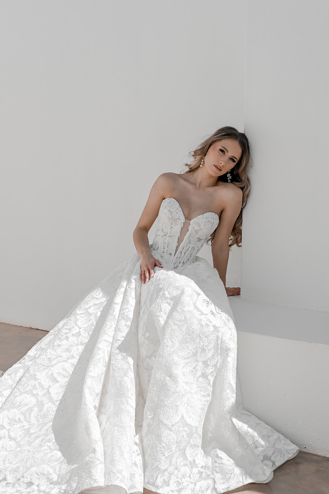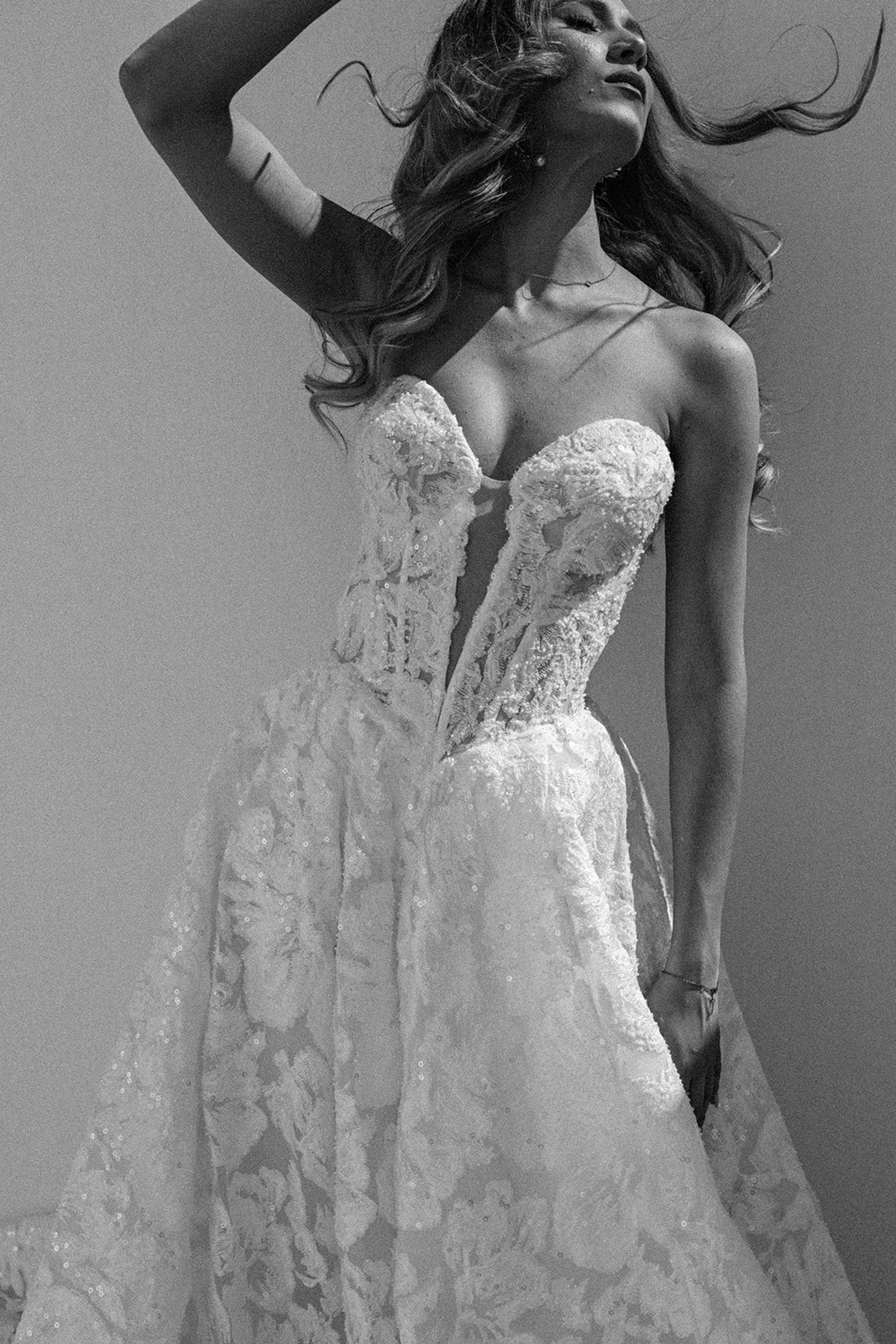 Maxine is where timeless bridal elegance meets contemporary allure. This full lace A-line gown is meticulously crafted in delicate embroidered lace, adorned with glass-beaded accents that sparkle subtly as you move. The structured corset bodice features a deep heart-shaped neckline with a plunging V inset, creating a perfect balance of romance and modern sophistication.