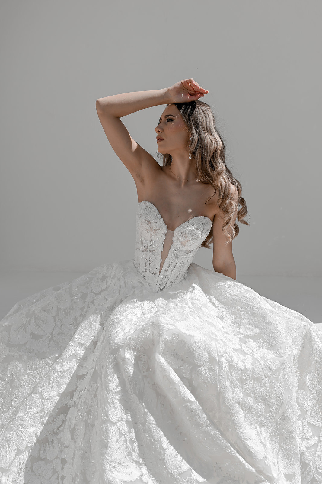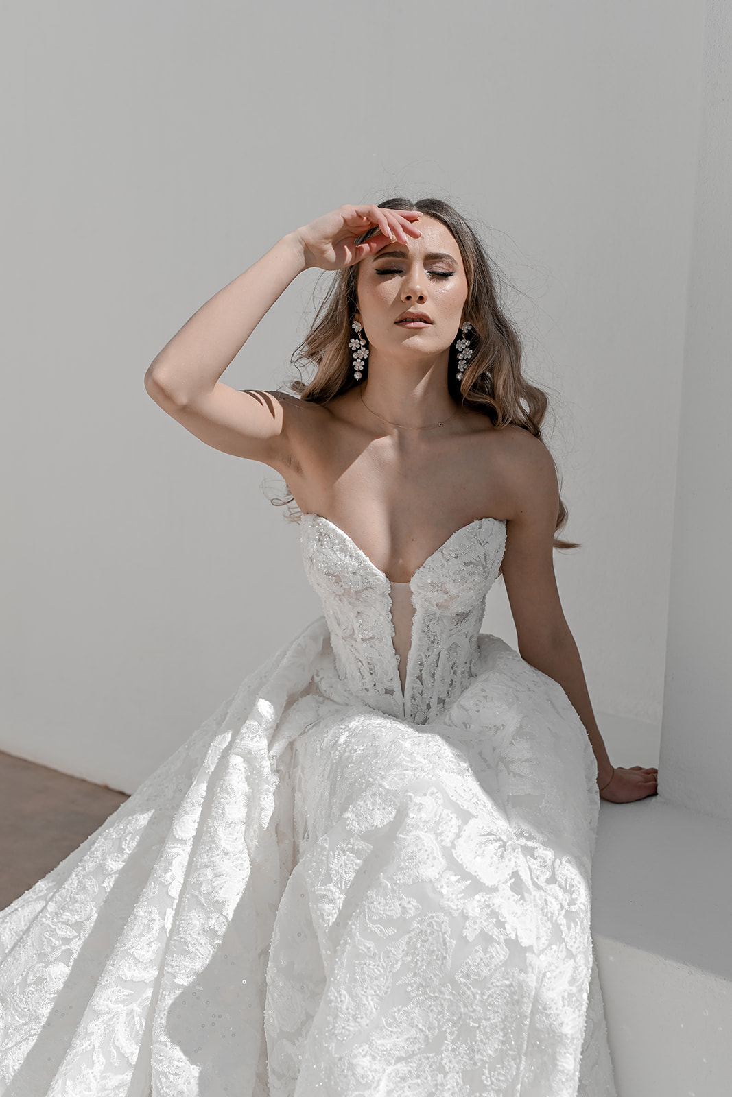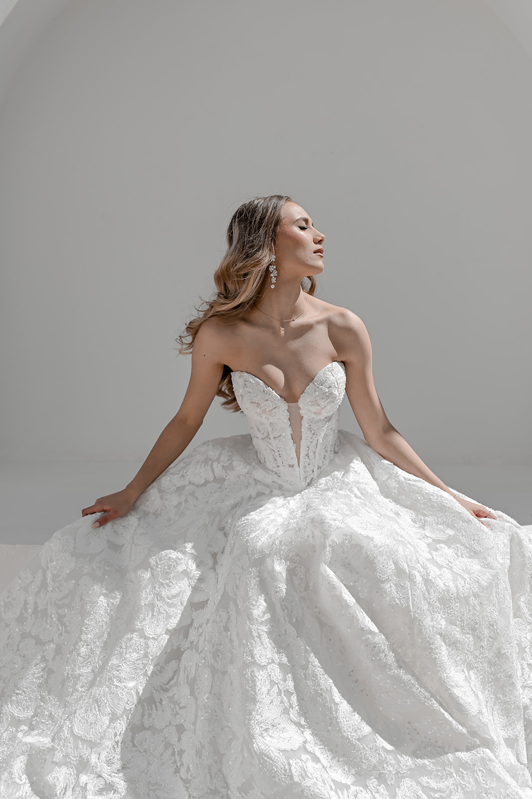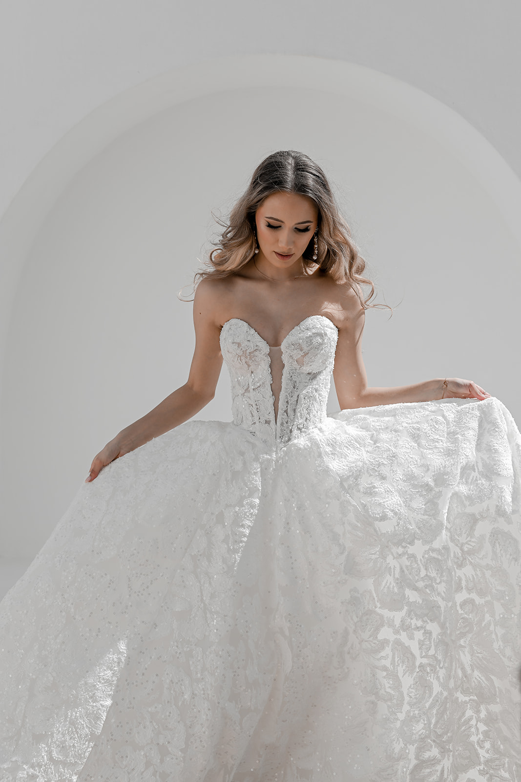 Maxine is where timeless bridal elegance meets contemporary allure. This full lace A-line gown is meticulously crafted in delicate embroidered lace, adorned with glass-beaded accents that sparkle subtly as you move. The structured corset bodice features a deep heart-shaped neckline with a plunging V inset, creating a perfect balance of romance and modern sophistication.