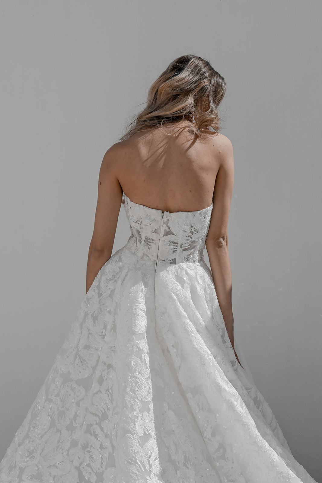 The defined basque waistline flatters the figure, flowing into a soft A-line skirt that drapes effortlessly, offering both comfort and grandeur. Every detail—from the intricate lace patterning to the hand-placed beading—speaks of refined craftsmanship and couture precision. Unique, on-trend, and endlessly graceful, Maxine is a gown for the bride who wants to make a statement while embodying true luxury on her wedding day.