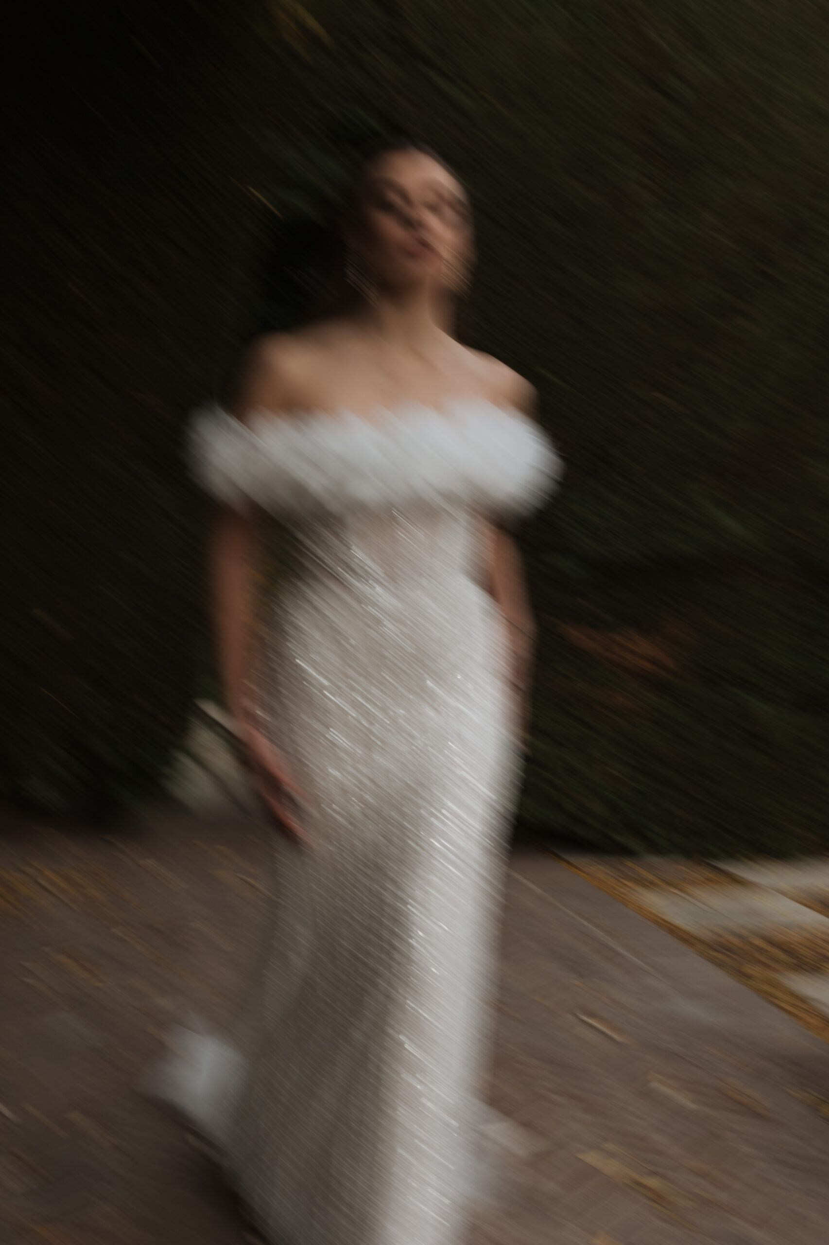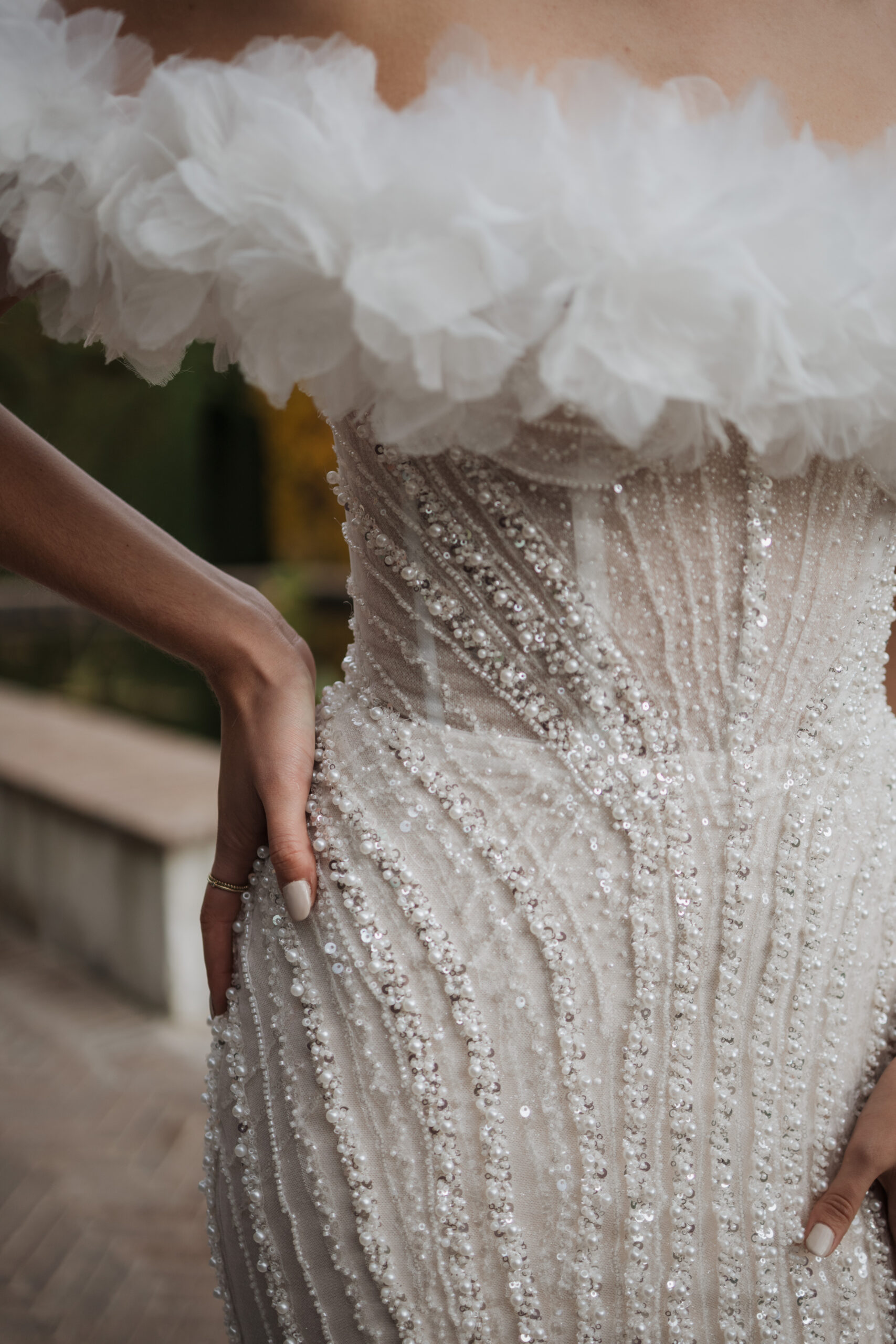 Throughout the bodice and skirt, delicate beadwork is masterfully placed to enhance the natural curves of the body. The beadwork is both structured and fluid — subtly sculpting the shape while shimmering with movement. The crested lines of beading cascade into the skirt, adding grace and polish to every step.