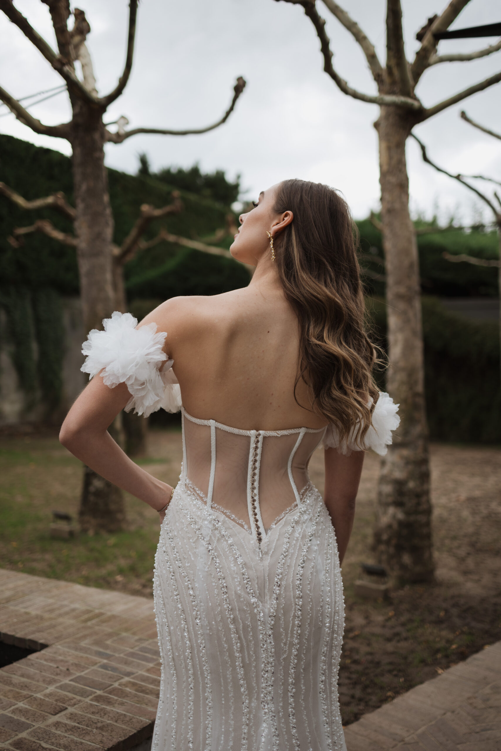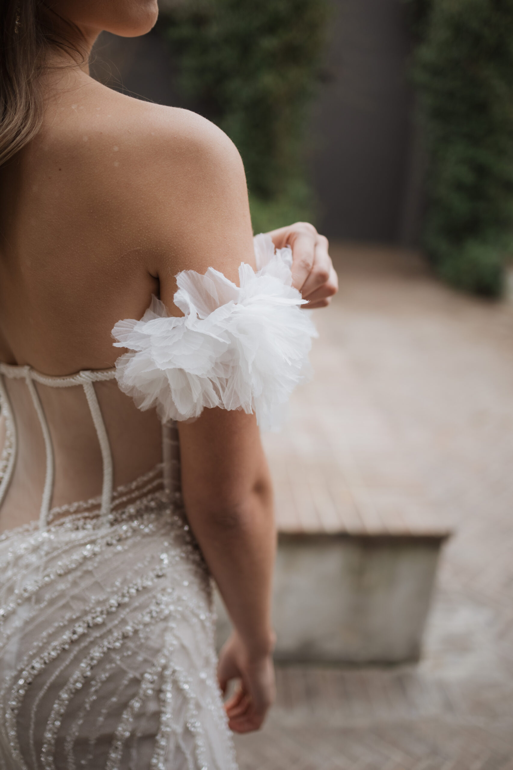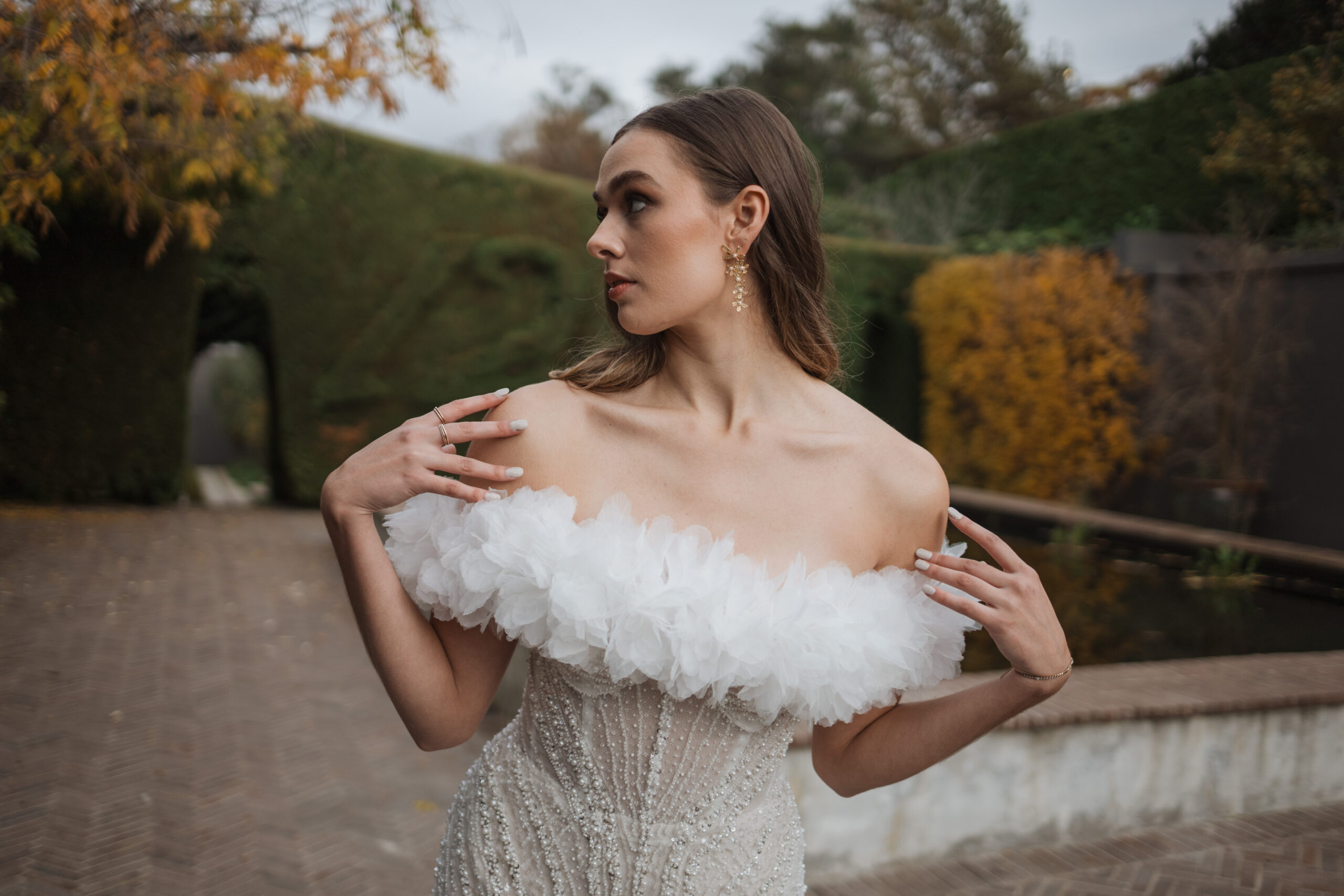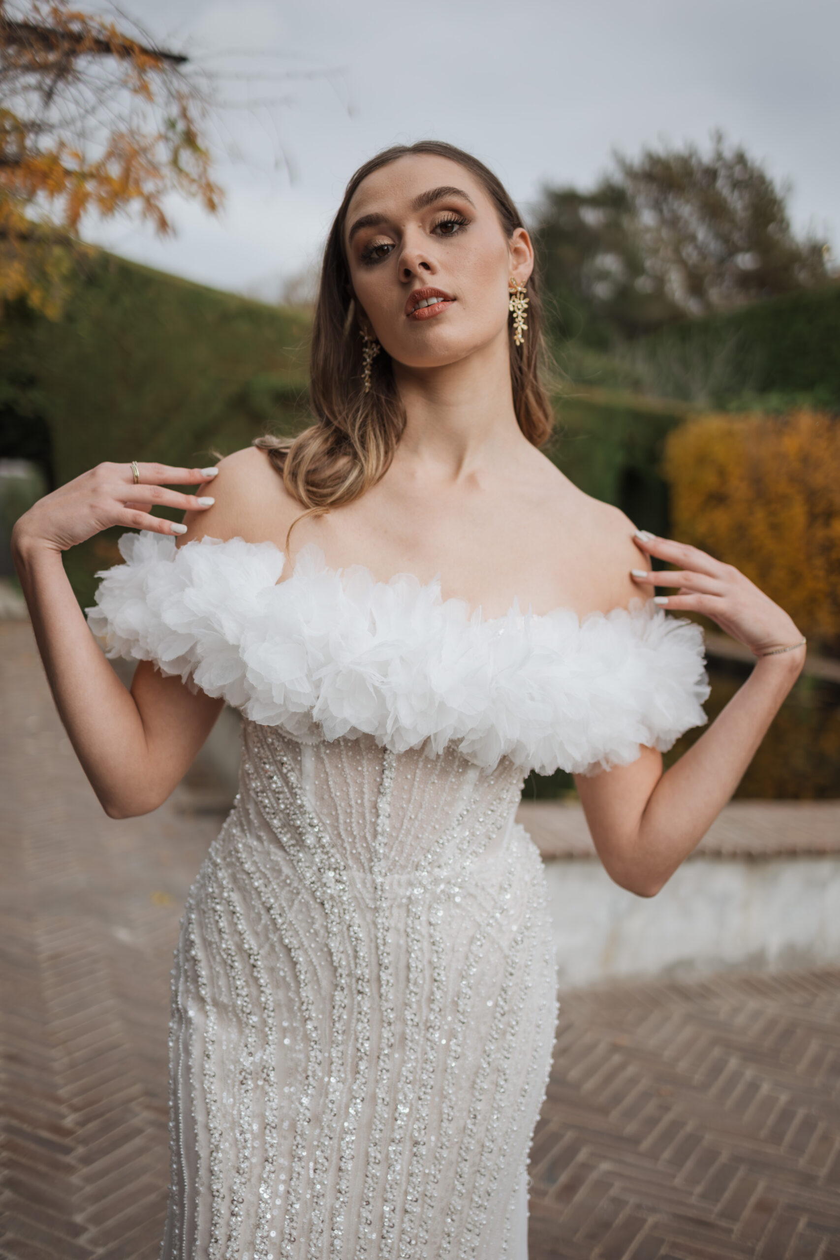 Melody is paired with a detachable 3D floral bolero — an optional couture touch that adds whimsy and volume across the shoulders. Styled together or worn alone, each piece tells a different story, giving the bride the flexibility to shift her look throughout the day.