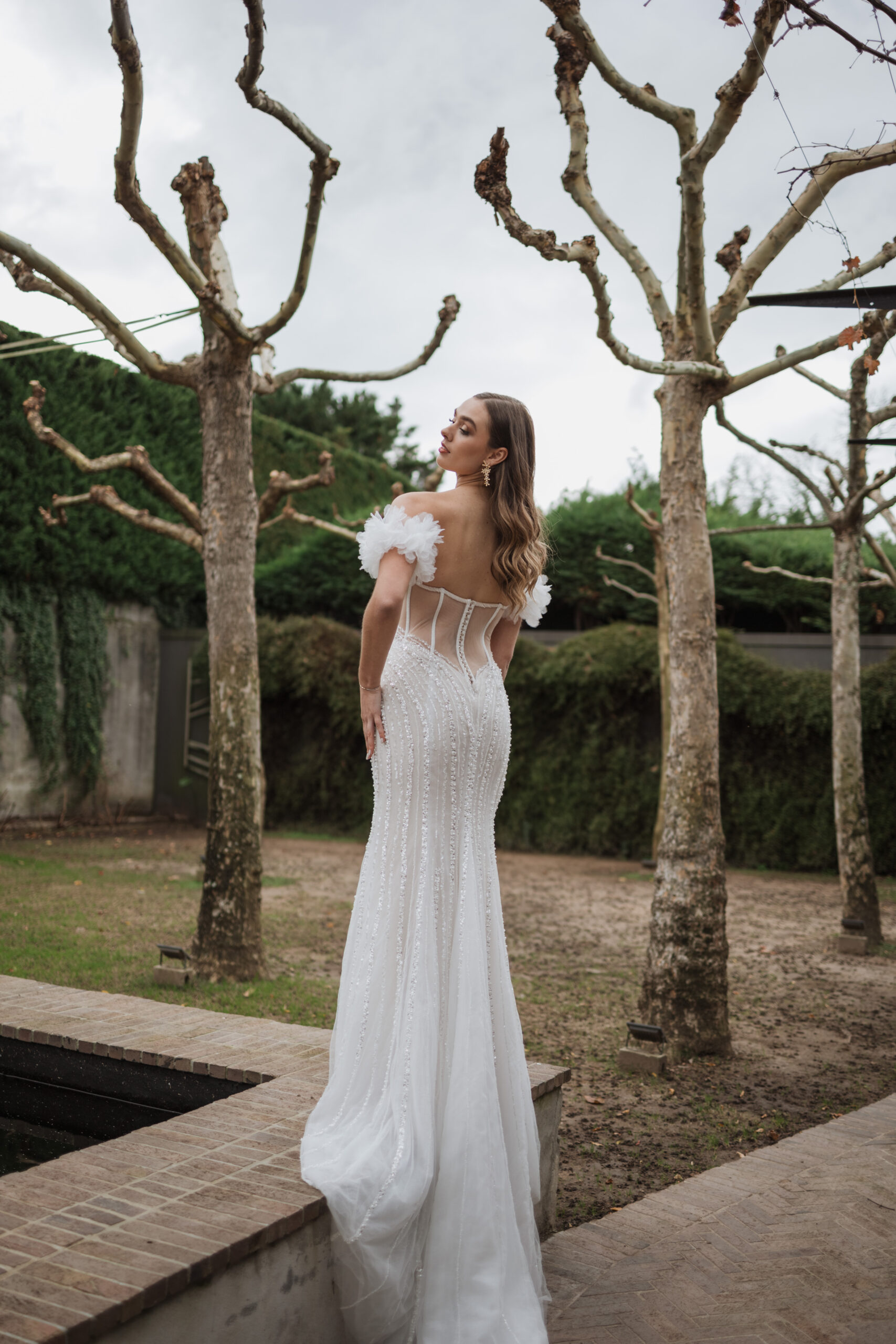 Melody is a striking fusion of glamour and modern refinement — a fully beaded fit-and-flare gown from the 2026 Blanco Couture Collection, designed to captivate from every angle.