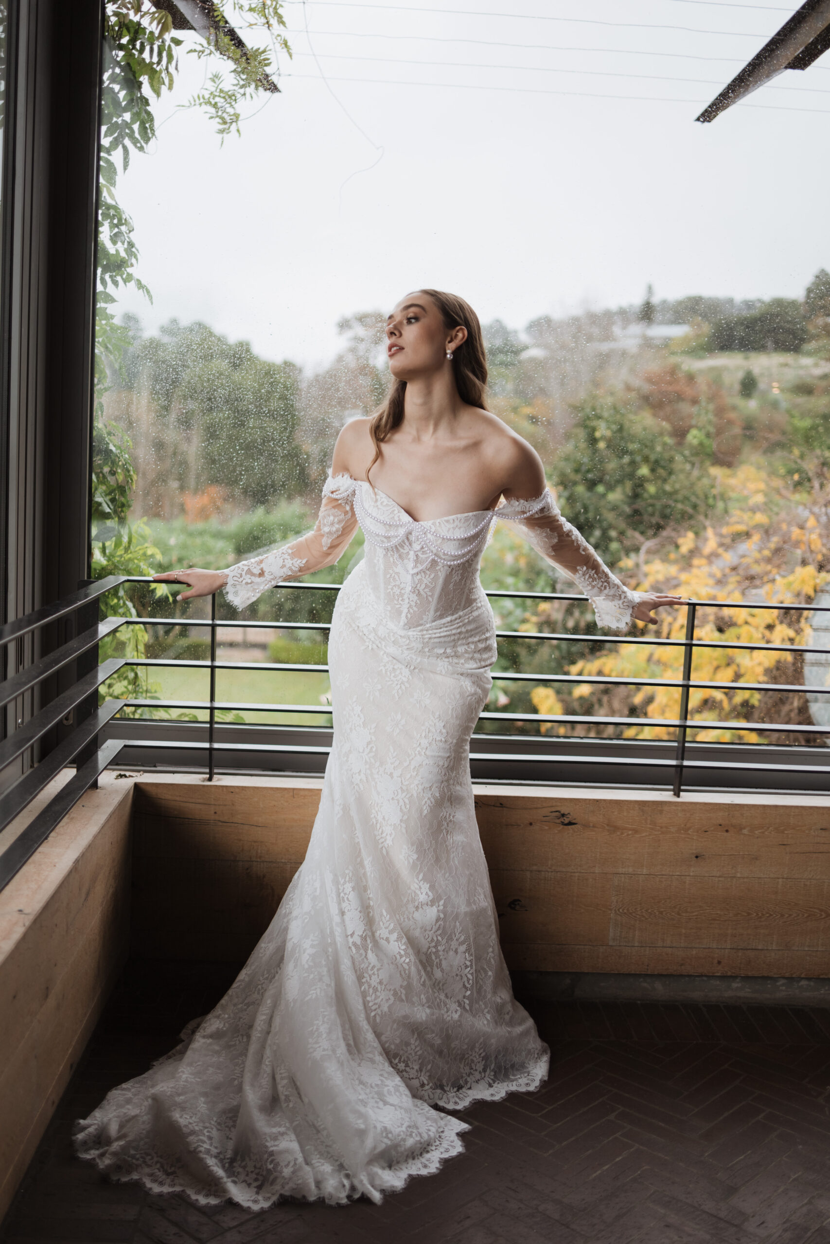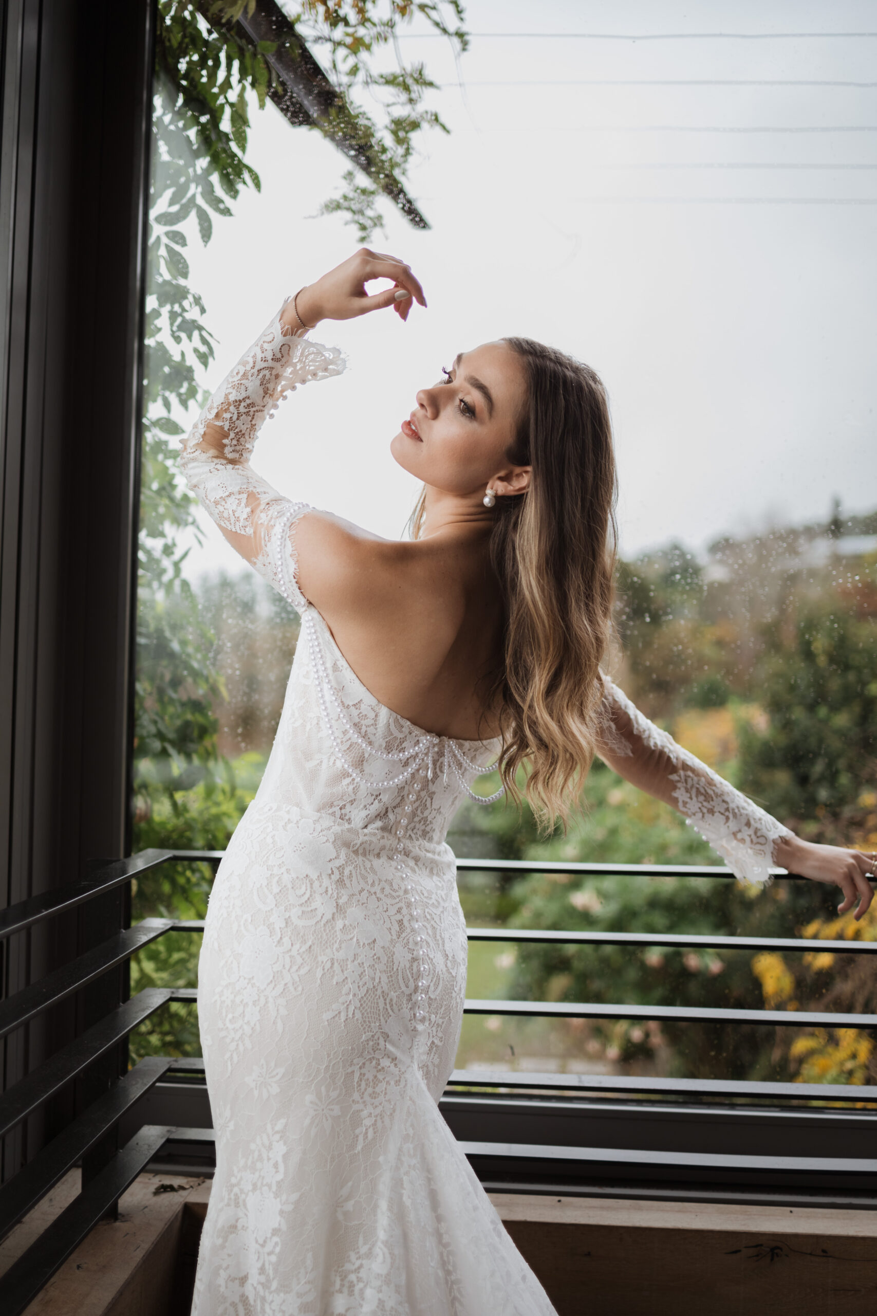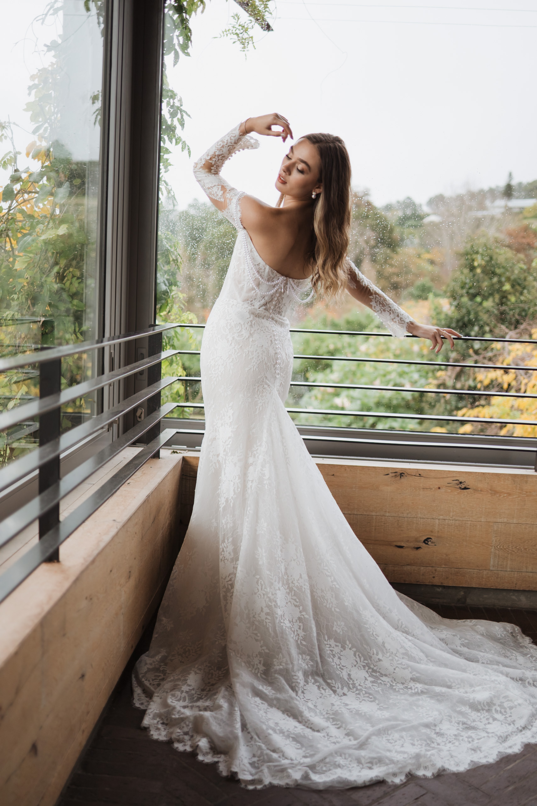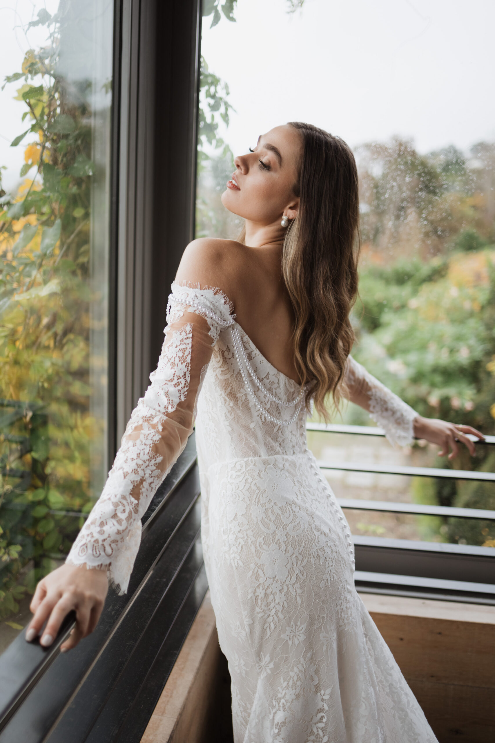 The silhouette gently hugs the body before flaring into a graceful skirt, creating a flattering and feminine shape. Detachable sleeves offer two looks in one. Wear them for a classic, ethereal effect during the ceremony, then remove them for a sleek, contemporary reception style.