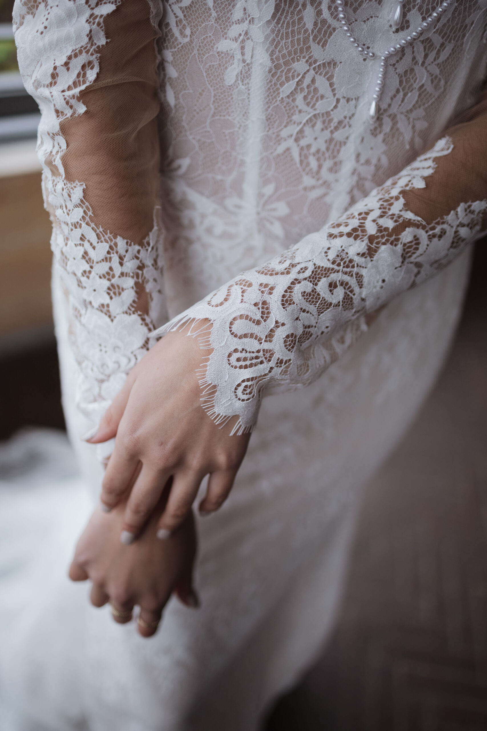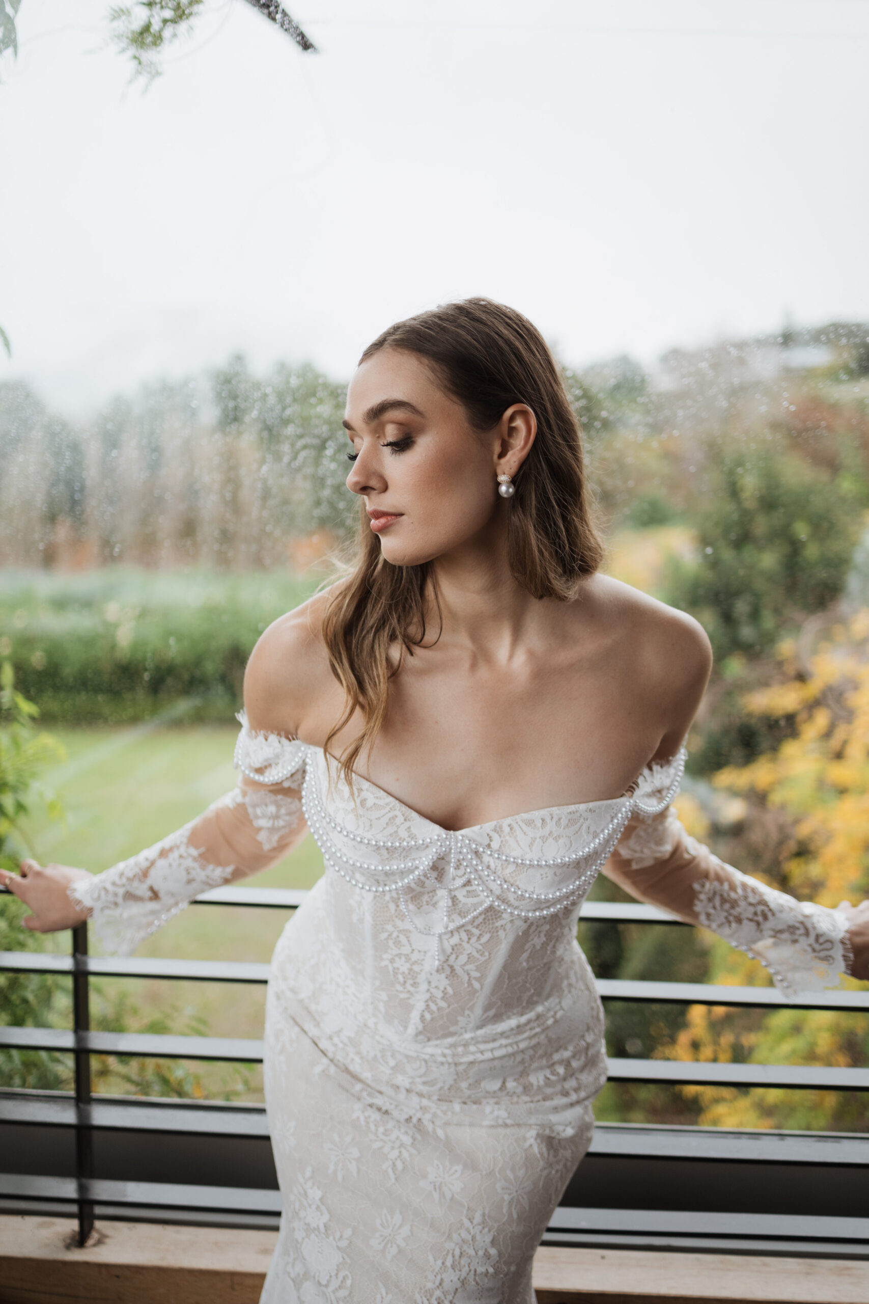 Micah is part of our Blanco Couture Collection and this stunning fit-and-flare wedding gown is the perfect blend of timeless elegance and modern romance. Crafted from delicate Chantilly lace, the dress features intricate pearl detailing that adds a soft, luminous touch from bodice to hem.
