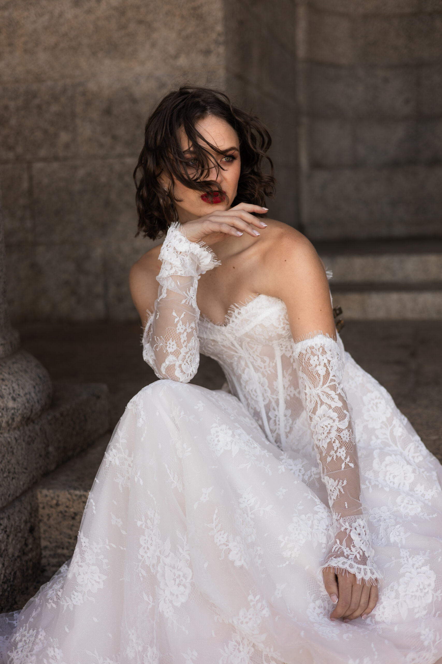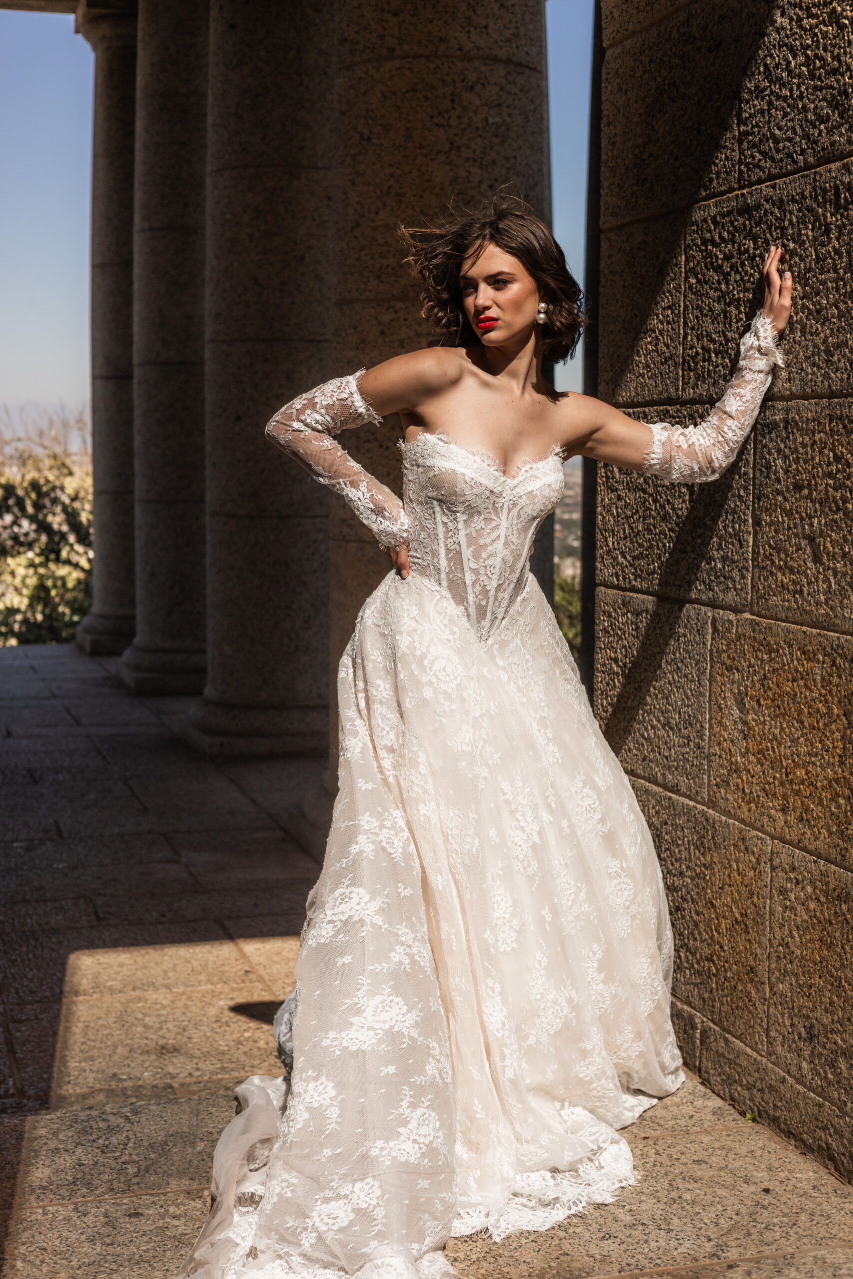 A captivating A-line gown crafted from delicate Chantilly lace, featuring a dramatic Basque waistline that flatters the figure. The exposed corset adds a touch of modern allure, while the elegant cat-eye neckline with Chantilly lace edging enhances its romantic appeal. Paired with fitted long sleeves in matching Chantilly lace, Monroe embodies timeless sophistication with a contemporary twist.
