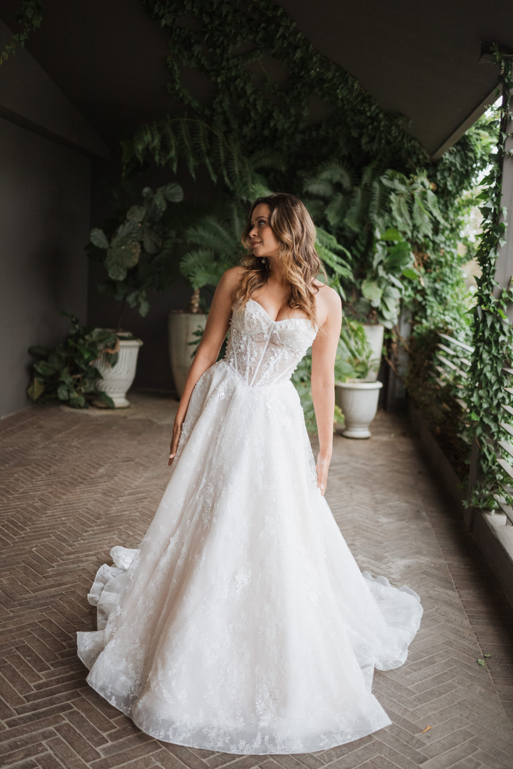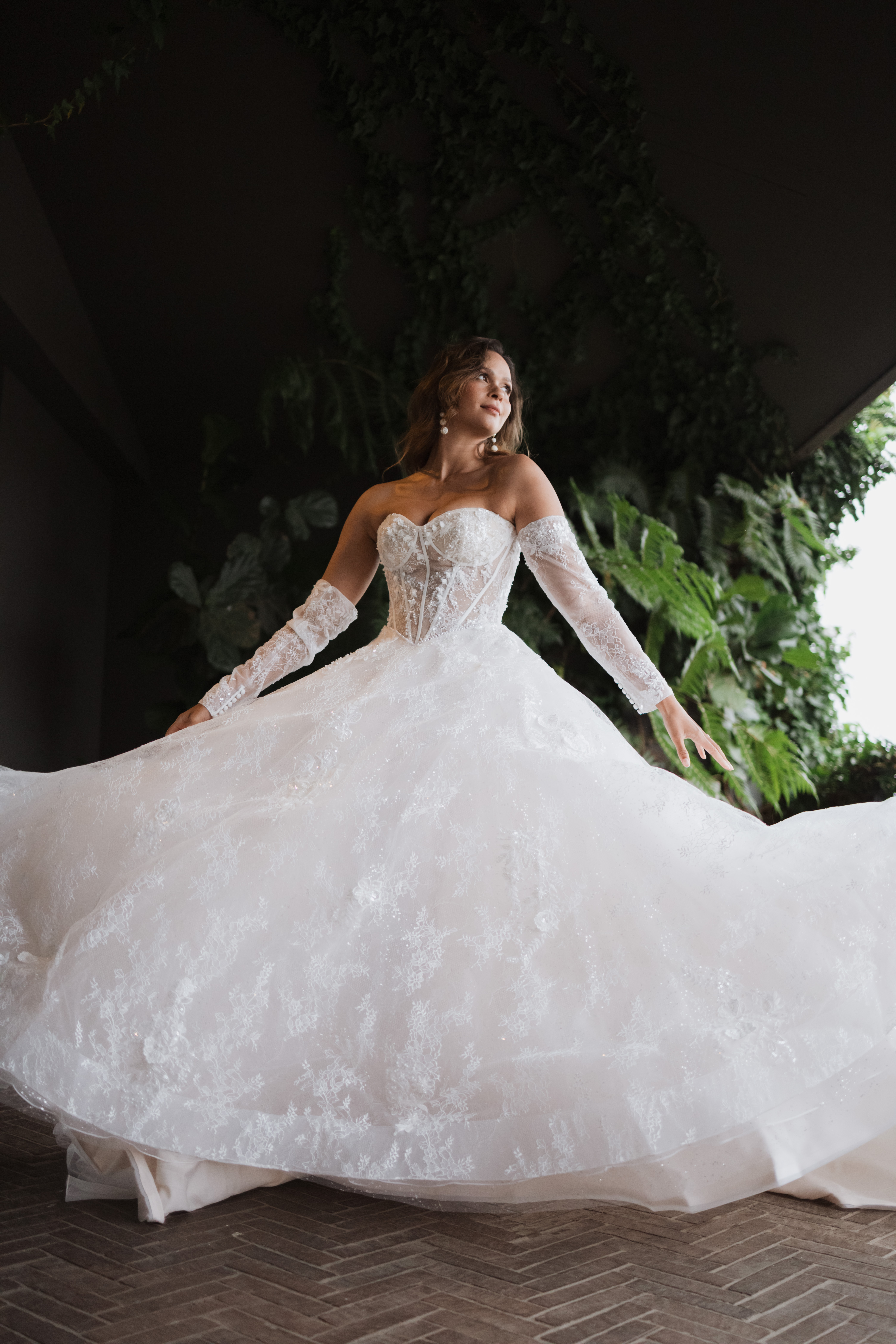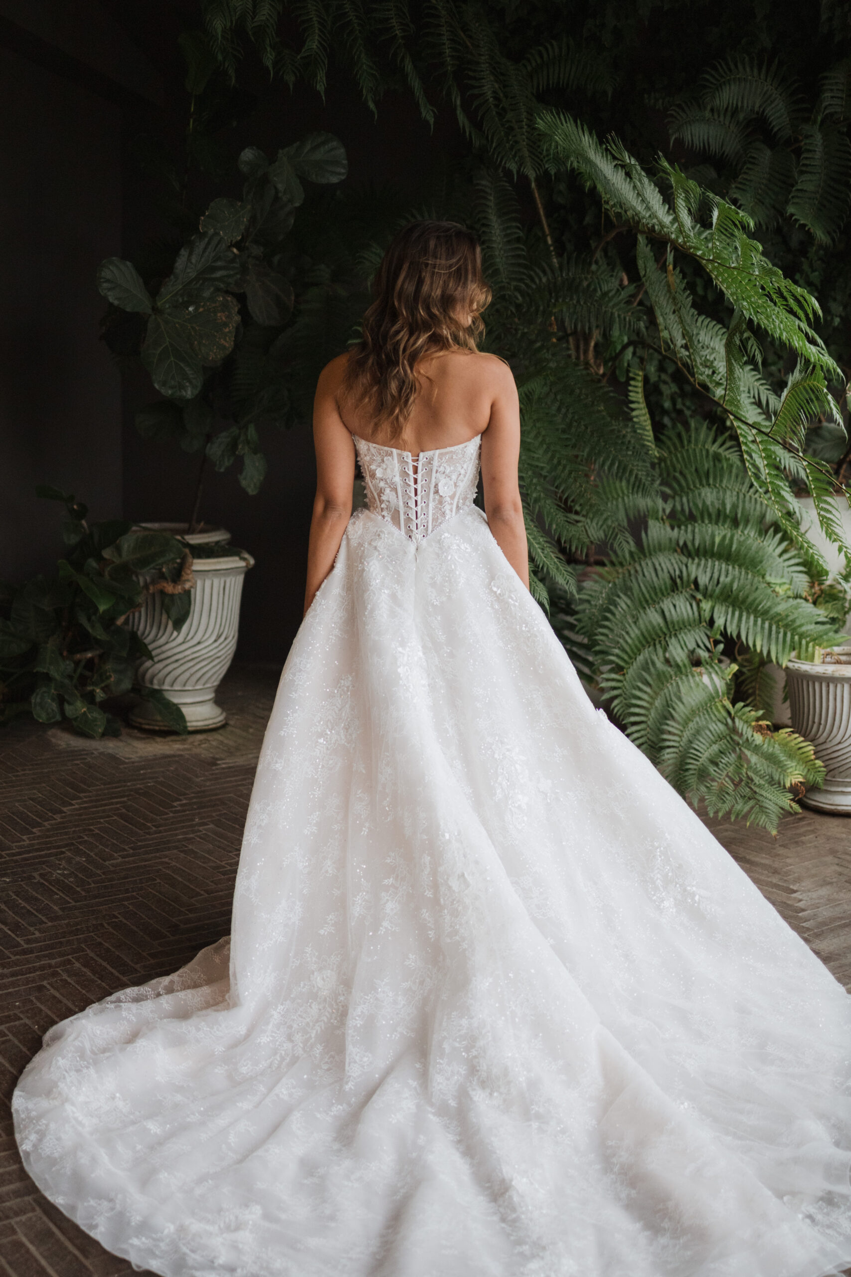 The full ball gown skirt creates dramatic movement and presence, perfect for a grand aisle moment or an unforgettable first dance. With its perfect blend of elegance, structure, and softness, Molly is more than just a gown. It’s a statement of style and romance.